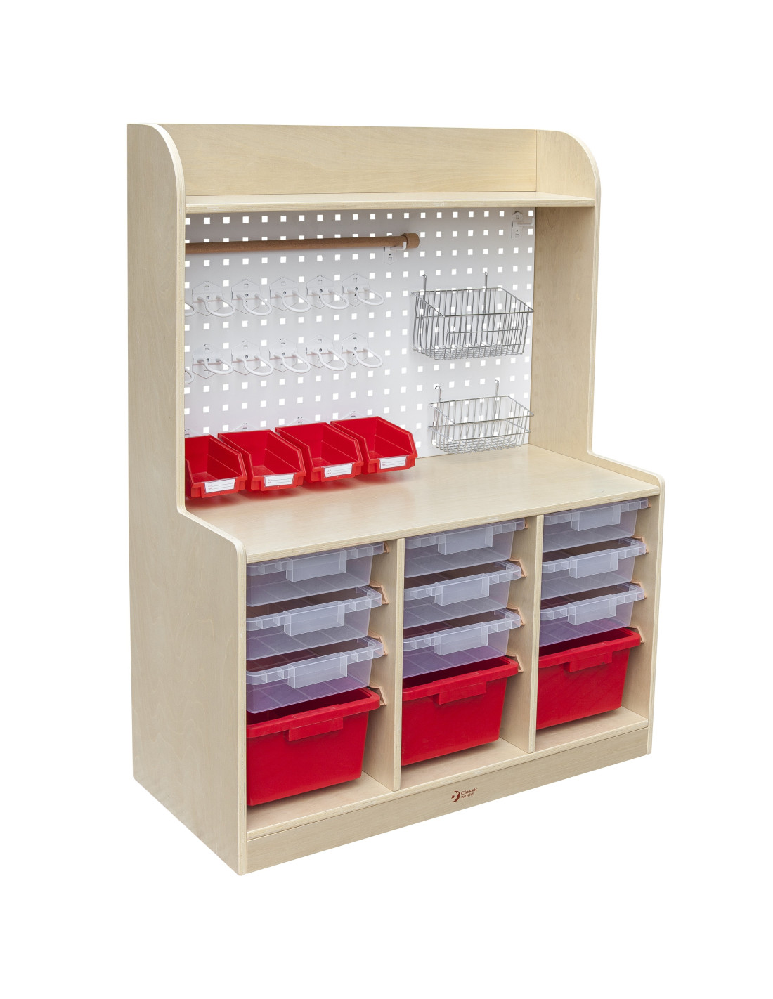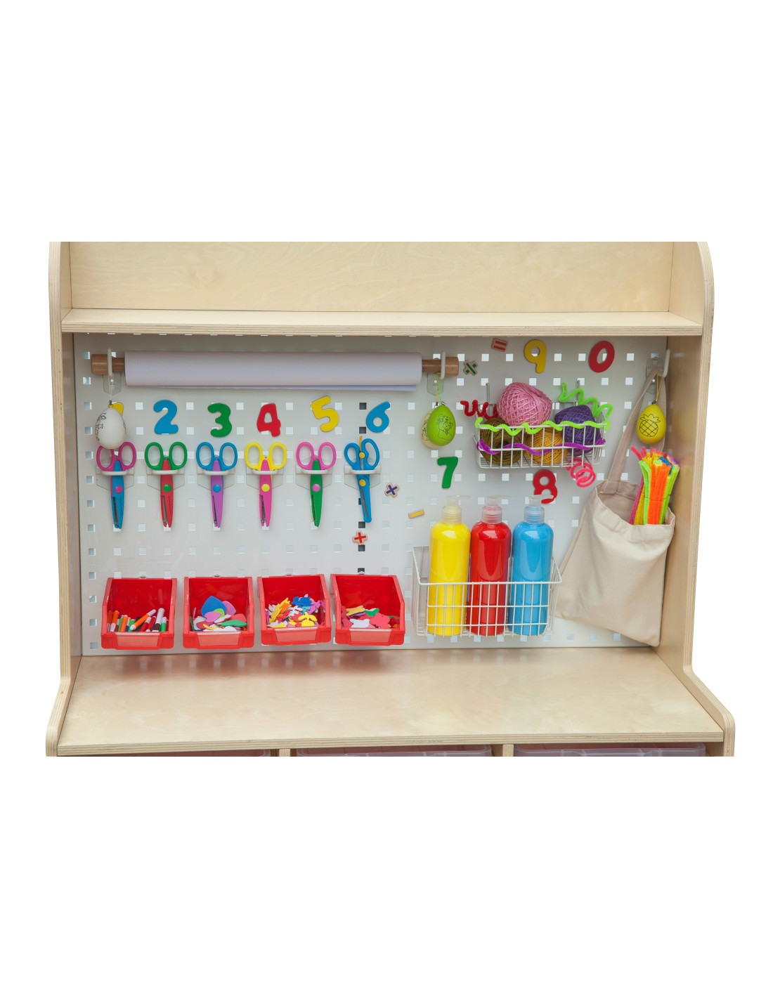 The CLASSIC WORLD Art Supplies Cabinet from the EDU series seamlessly combines a tool wall and drawers for art supplies. It can both display and store art supplies and DIY tools like scissors, glue, drawing paper, and paint pots. All in one place!