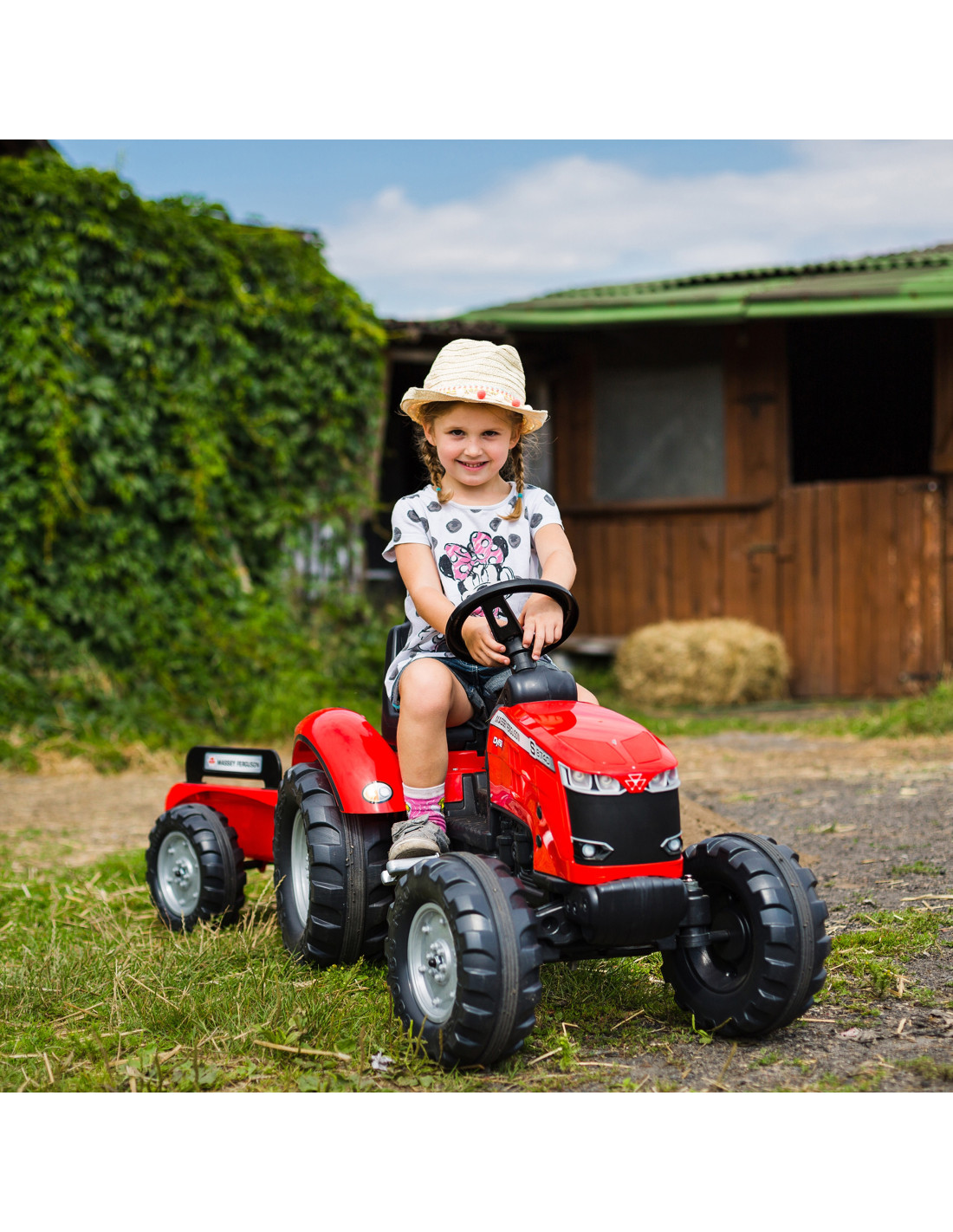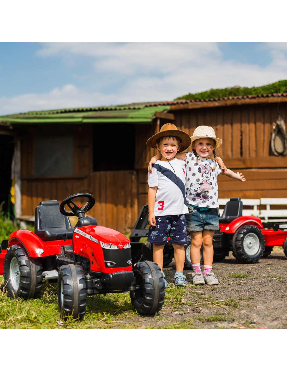 The Massey Ferguson Pedal Tractor with Trailer from FALK is a dream come true for many a young tractor driver . Meticulously crafted with attention to the smallest detail! No farmer would shy away from one. Crafted from the highest quality plastic, this vehicle is suitable for children aged 3 and up . It features a detachable trailer with panels and a steering wheel with a horn. The tractor's wheels are made of high-quality plastic .