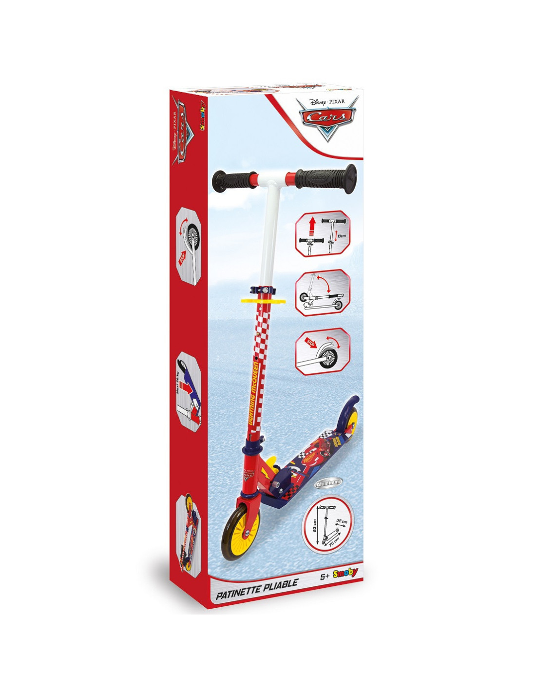 This two-wheeled scooter, licensed from the cartoon Cars 3, was created with fans of the cartoon in mind. This intuitive two-wheeled scooter features a wide and stable deck and contoured grips. This makes it the perfect scooter for learning, ensuring comfort while riding, and supporting children's psychomotor development.