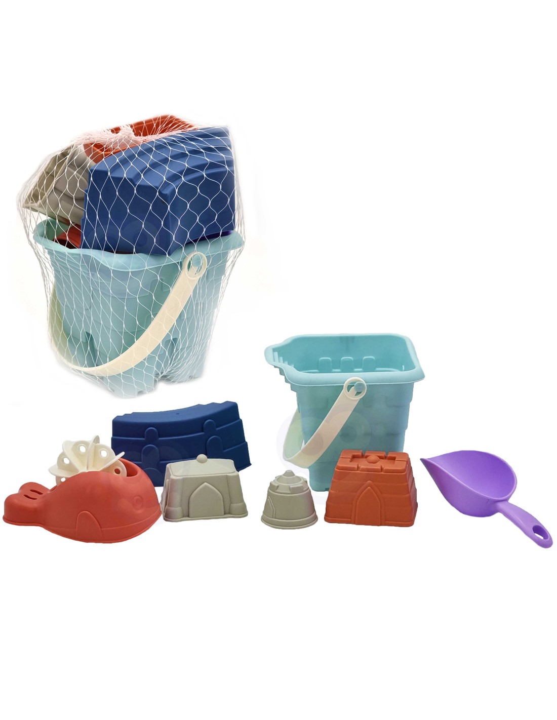 The WOOPIE Sand Bucket Set is a great addition to the sandbox or even the garden. The set includes 7 pieces : a bucket, a watering can, 4 molds, a shovel, and a spinning wheel. The set features a beautiful pastel design . The bucket has a convenient carrying handle . Guaranteed fun in the sandbox , on the beach , or even in the garden !