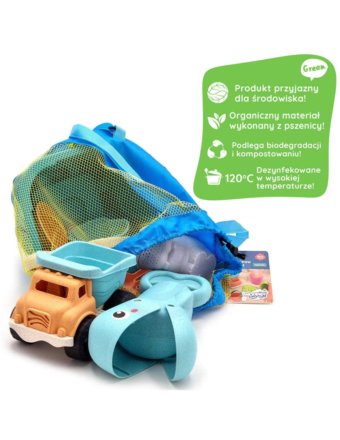 Sand in a Bucket Set from the WOOPIE brand from the GREEN series is a great addition to a sandbox or even a garden. The set includes 9 pieces : a bucket, a watering can, 3 molds, a fish shovel, a spade and rake, and a toy car. The bucket and watering cans have a convenient carrying handle . The set features a trendy pastel design and is made of organic and biodegradable (self-degradable) material. It is also compostable . This product is safe for children – disinfected at 120 degrees Celsius. Guaranteed fun in the sandbox , on the beach , and even in the garden ! This product is environmentally friendly!