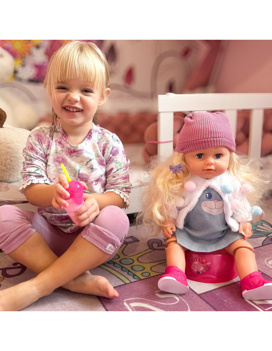The Zosia doll in a hat from the WOOPIE brand from the ROYAL series is just like a real baby. The little one is 43 cm tall and can drink from a bottle. The set includes a bowl for feeding the baby and a diaper for changing. The doll has drinking, peeing, and tearing functions. Her arms and legs are fully movable , and she can stand and sit . Zosia is adorable thanks to her thick, silky hair, which can be brushed with the included brush . The doll comes dressed in a hat and a sweatshirt/sweater with pompoms (the doll can be removed), and you can put on accessories like hair bands and hair clips. Playing with the doll helps your child develop a sense of empathy and responsibility!