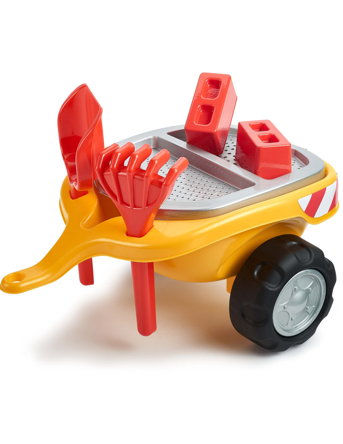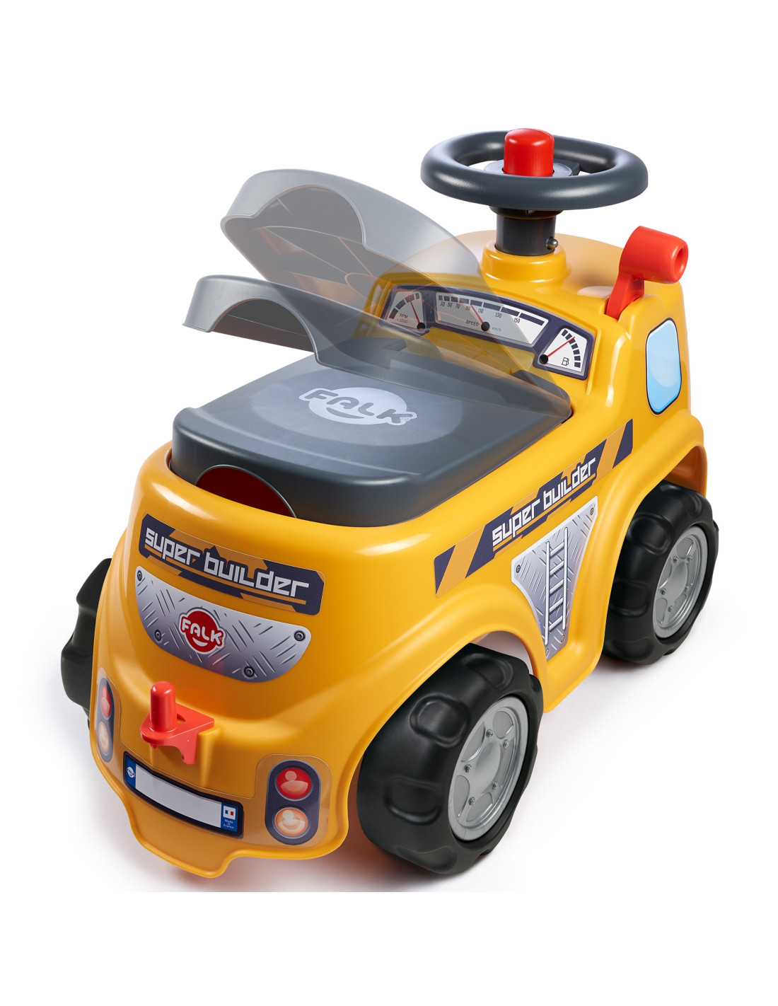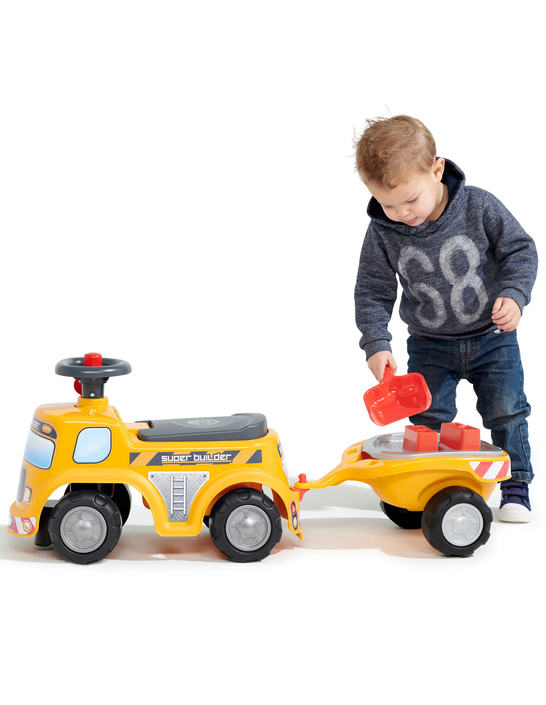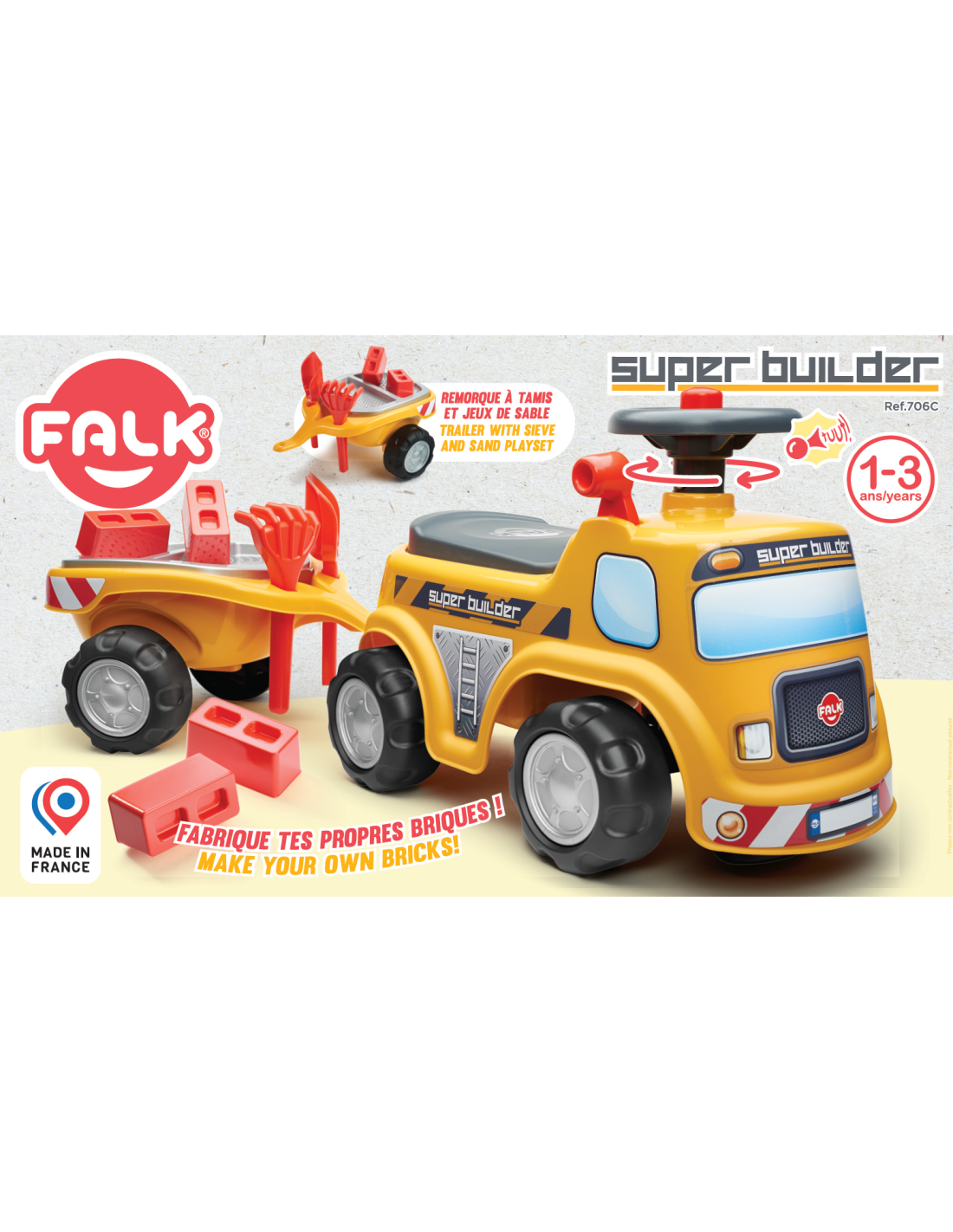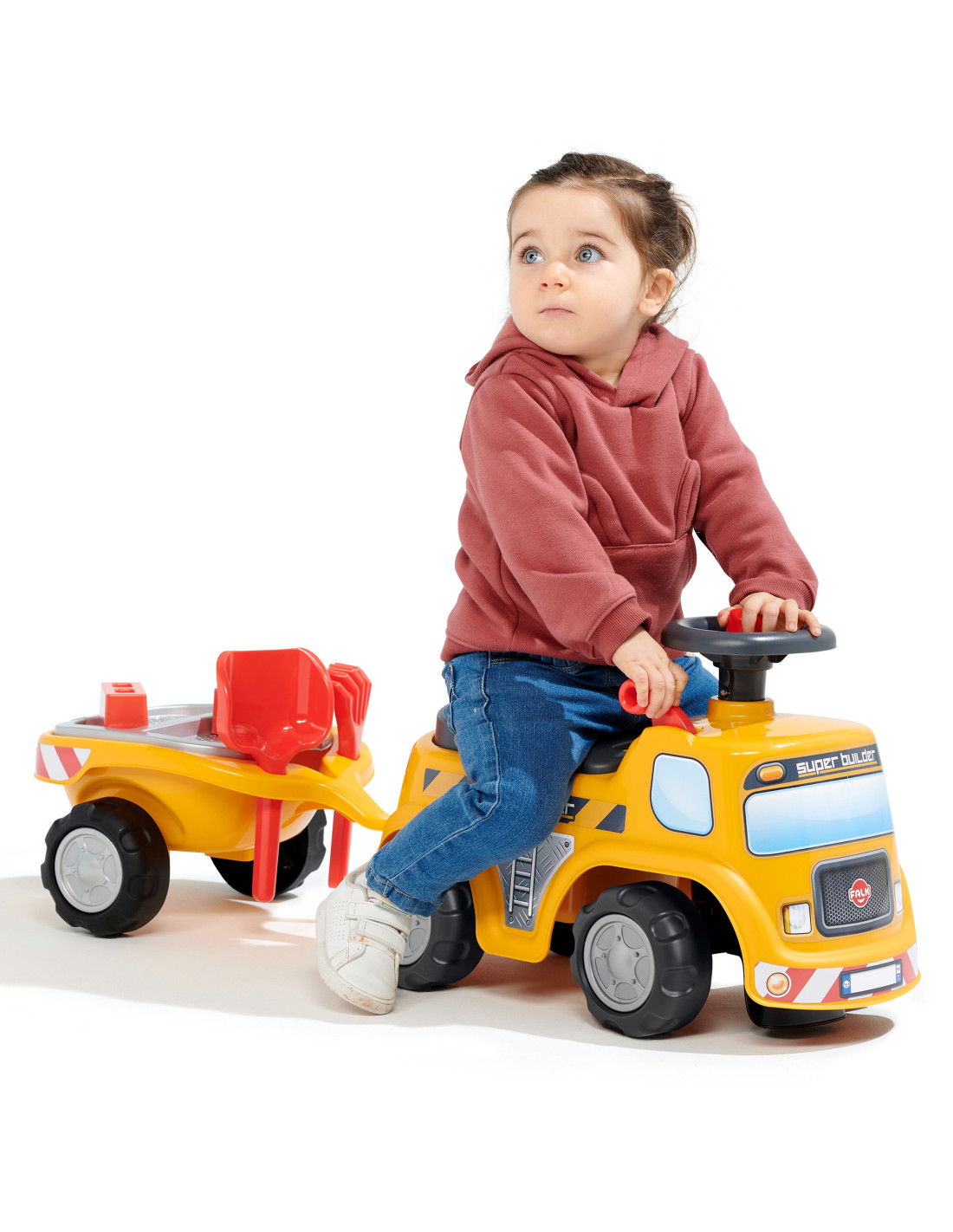 The FALK Ride-on Builder Tractor with Trailer is a dream come true for many a little builder. Meticulously crafted , with attention to the smallest detail ! No true builder would be disappointed. Crafted from the highest quality plastic , this vehicle is suitable for children aged 12 months and up. It features a detachable trailer with panels and a steering wheel with a horn . The ride-on wheels are made of high-quality plastic . Additionally, the vehicle comes with a rake, shovel, and bricks for your child to play with.