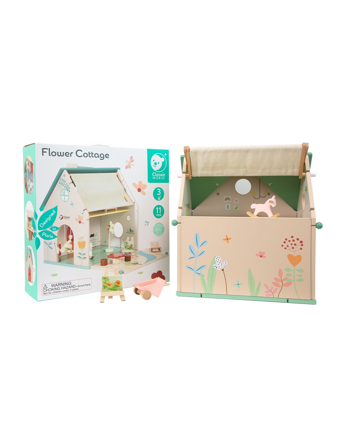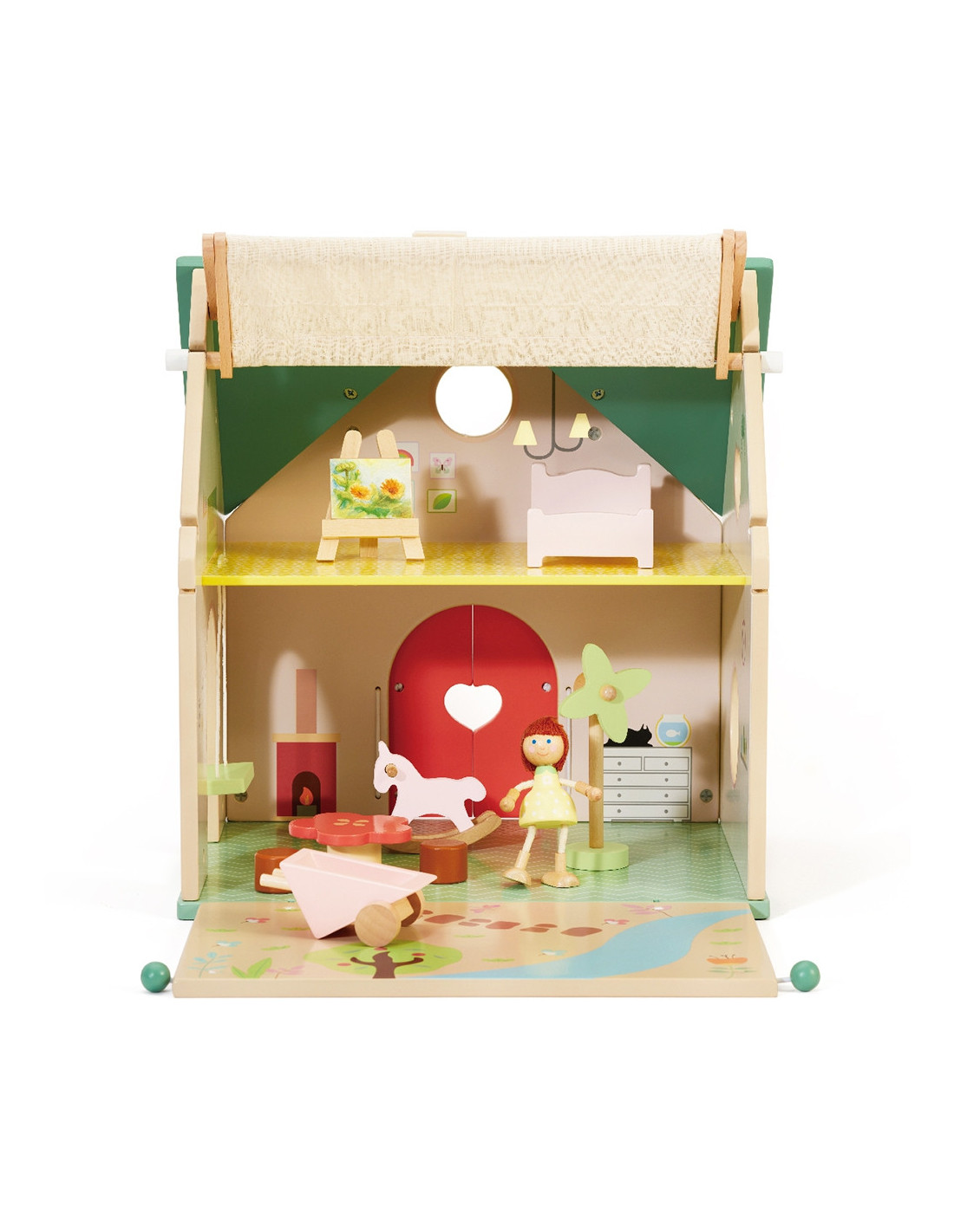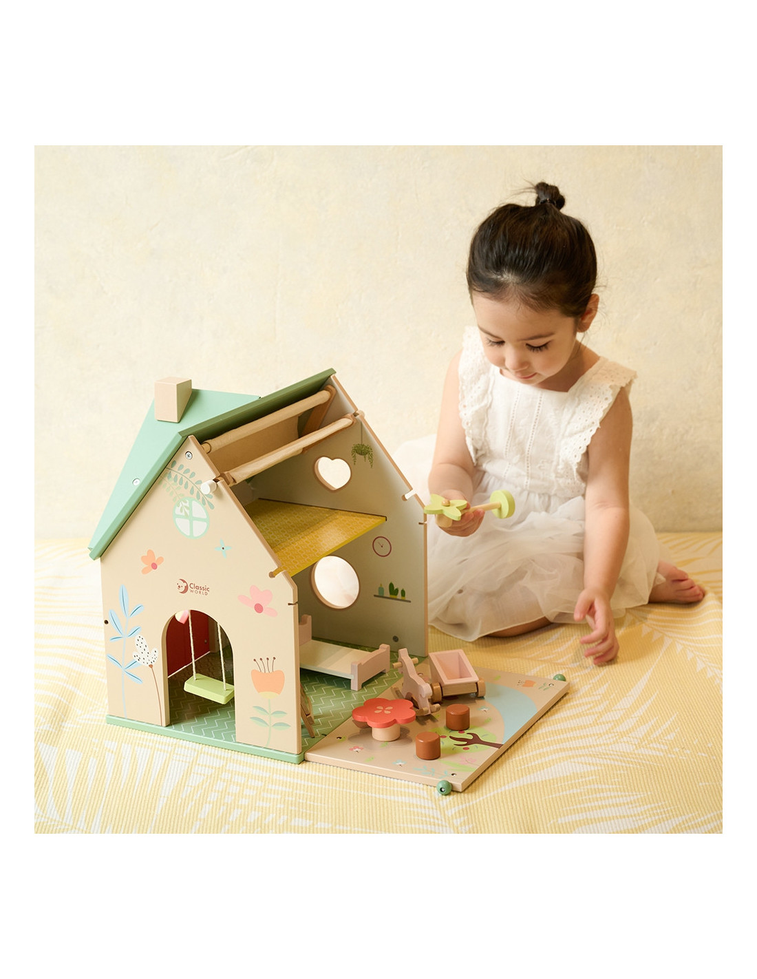 The Country House from CLASSIC WORLD will provide your child with endless fun! This unique dollhouse will spark your child's imagination . The house is fully functional . You can fold down the retractable roof to let in the sun and lower the side wall for a garden. Additionally, the doll can swing on the house's swing . The set includes a doll, swing, rocking horse, easel, wheelbarrow, windmill, and furniture, including a bed, chairs, and a table. The set is made of natural wood . This unique house will encourage your child to create stories and adventures for little dolls.
