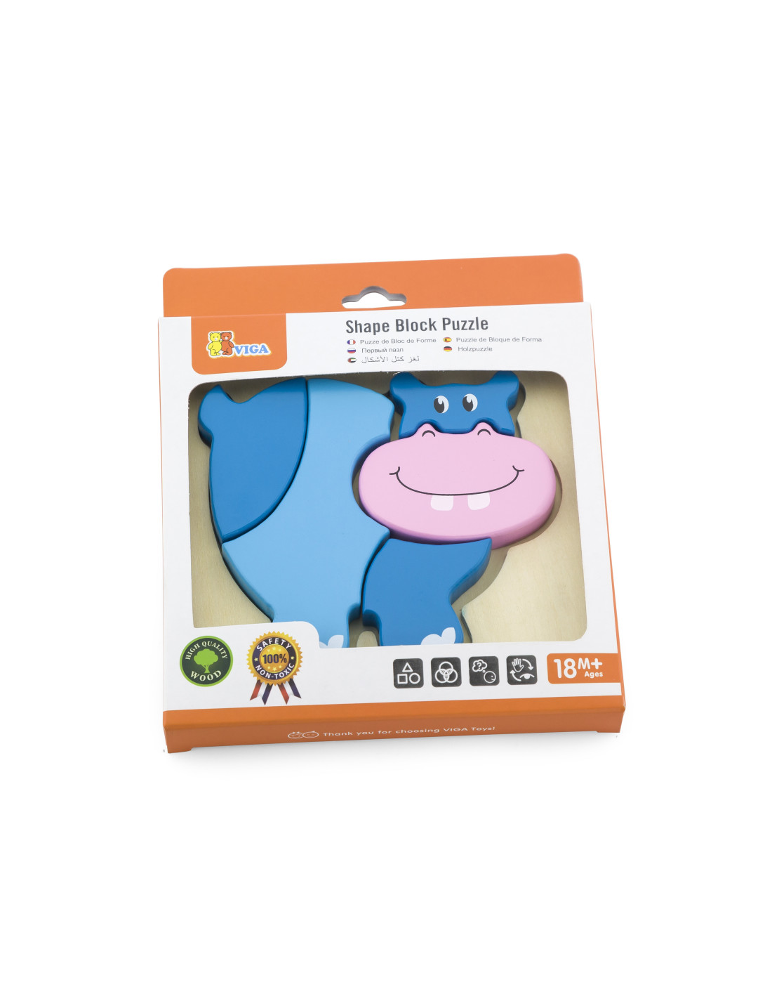 Wooden Mini Puzzles from the renowned Viga brand for children It's the perfect solution for both home and preschool play. The puzzle consists of five pieces that together form a hippopotamus . The wooden base features a recessed shape that matches the colorful puzzle pieces.