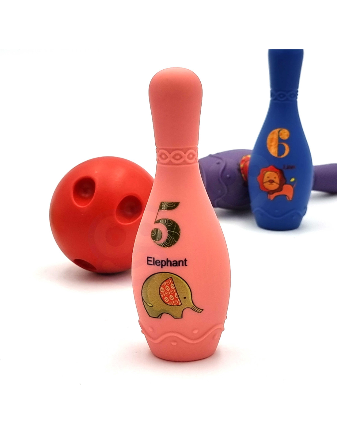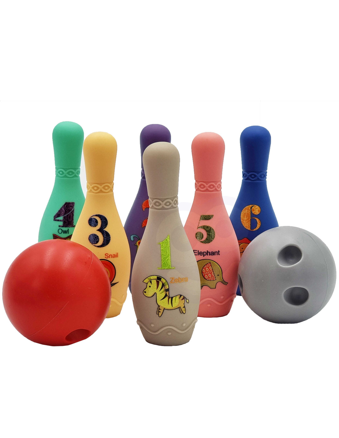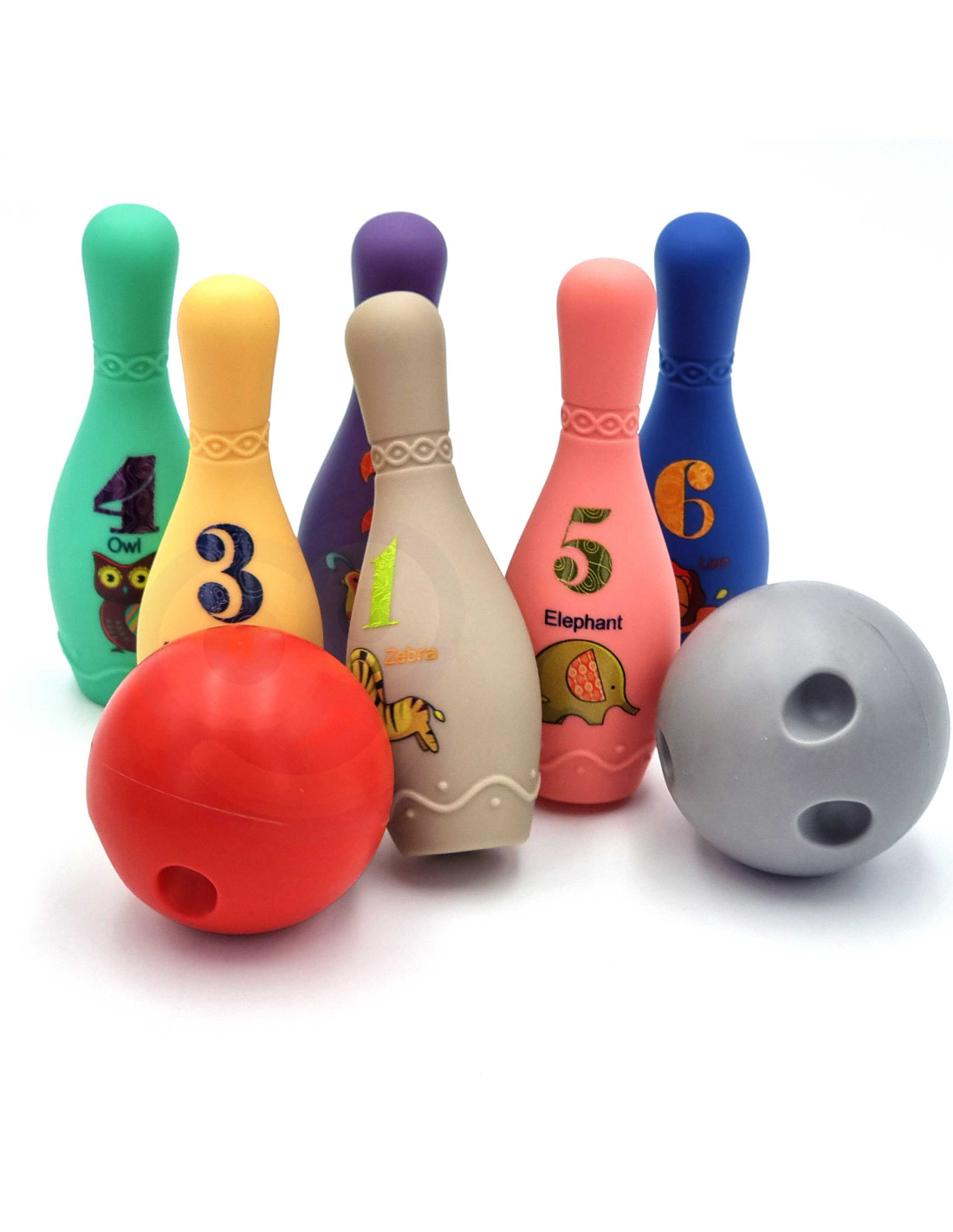 - - 6 colored bowling pins,