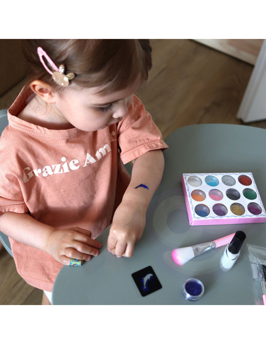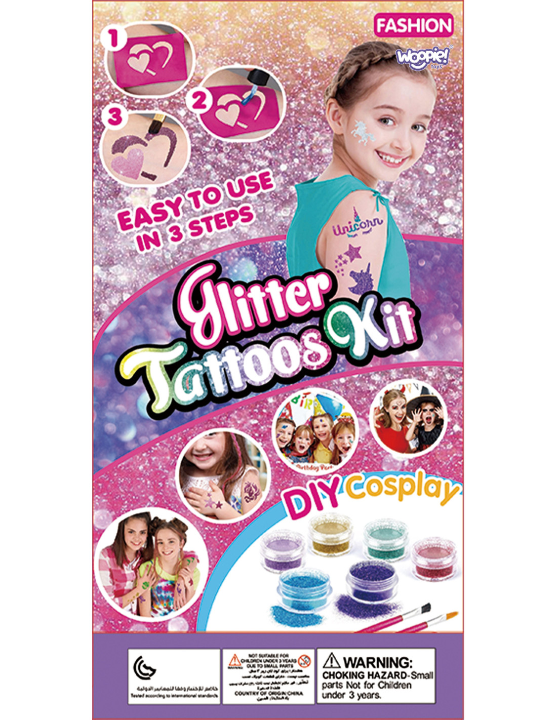 The WOOPIE Tattoo Kit from the ART&FUN series will allow you to create your own unique style! This kit looks just like the real thing. It includes 24 loose glitters, a tattoo set, two nail polishes, an eyeshadow palette, and a brush set. The kit is 100% safe for children. It develops early interests , manual skills, and above all, imagination and creativity in creating a unique style!
