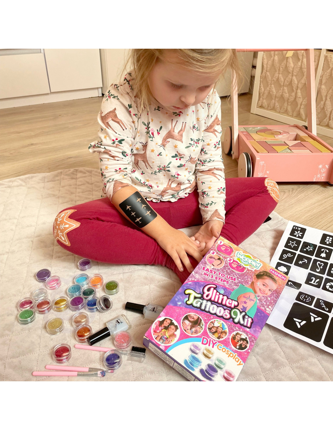 The WOOPIE Tattoo Kit from the ART&FUN series will allow you to create your own unique style! This kit looks just like the real thing. It includes 24 loose glitters, a tattoo set, two nail polishes, an eyeshadow palette, and a brush set. The kit is 100% safe for children. It develops early interests , manual skills, and above all, imagination and creativity in creating a unique style!