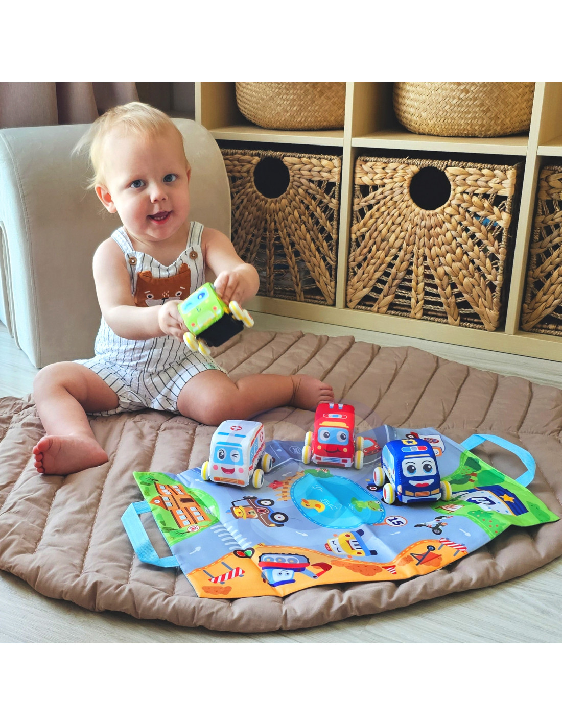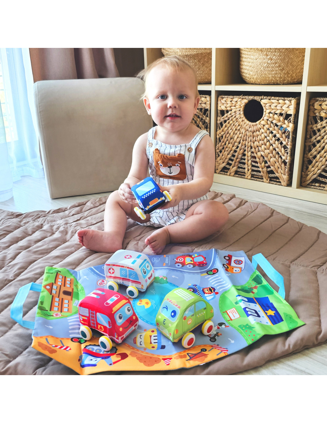 The Plush Cars with Road Mat Set from WOOPIE is a great toy for your child. Your child can sit on the mat and control the cars . They can squeeze the cars because they're filled with cotton wool. Pull the car back and release it, and it will drive on its own. The cars have rubber tires with rubber pads. The set includes four cars (a fire truck, a police car, an ambulance, and a taxi) and a soft mat. After playing, your child can fold the mat in half and carry it like a suitcase, carrying the cars in it. The mat will develop your child's manual dexterity , imagination , and creativity .