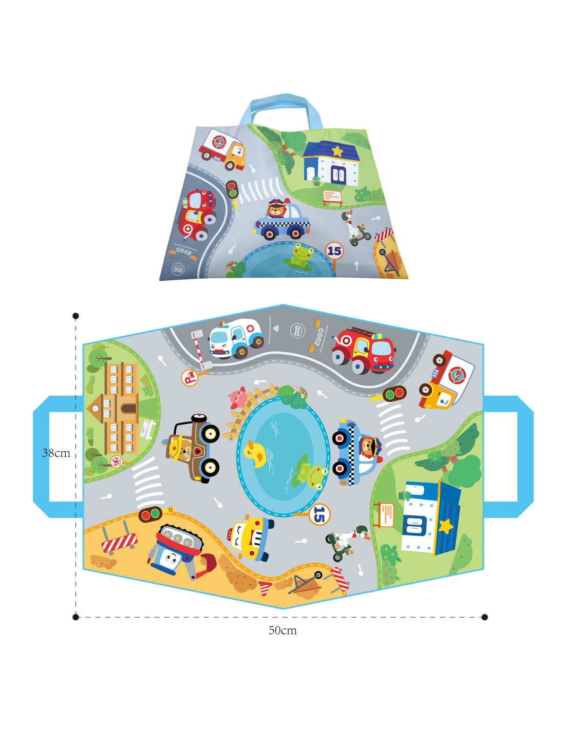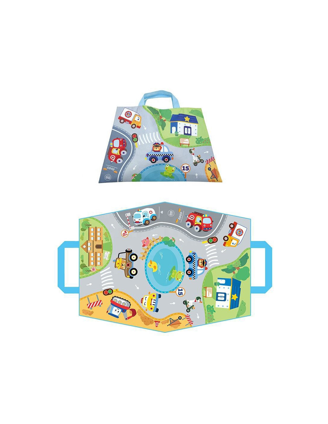 - - the mat can be folded into a bag and the cars can be carried .