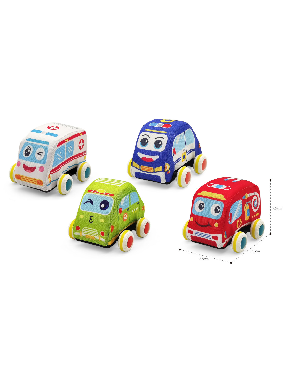 - - 4 soft cars: fire brigade, police car, ambulance and taxi.