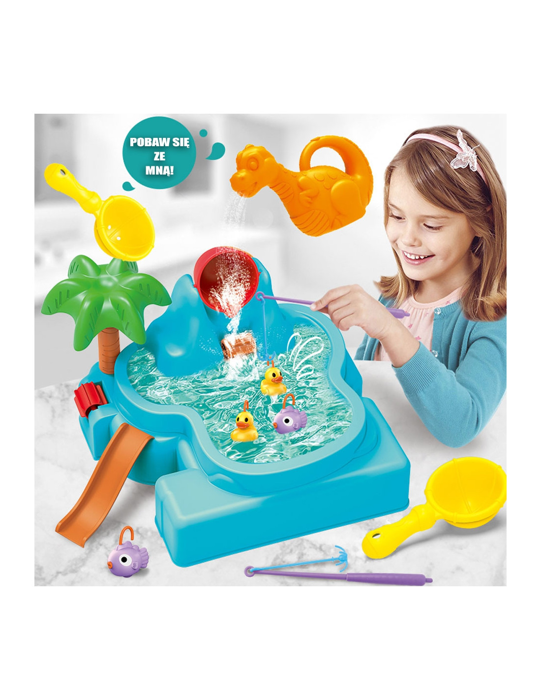 The 2-in-1 Water Table Fishing Game from the renowned WOOPIE brand is the perfect product for endless fun. Beautiful, colorful elements in the form of fish and ducks will surely attract your child's attention. Fishing with a fishing rod will improve your child's dexterity . The set includes 6 elements: a pond, fishing rod, water scoop, duck, fish, and watering can. The table has a built-in waterfall , water mill , and slide . The fishing rod rotates 360 degrees , so it can be freely adjusted and positioned at any angle.