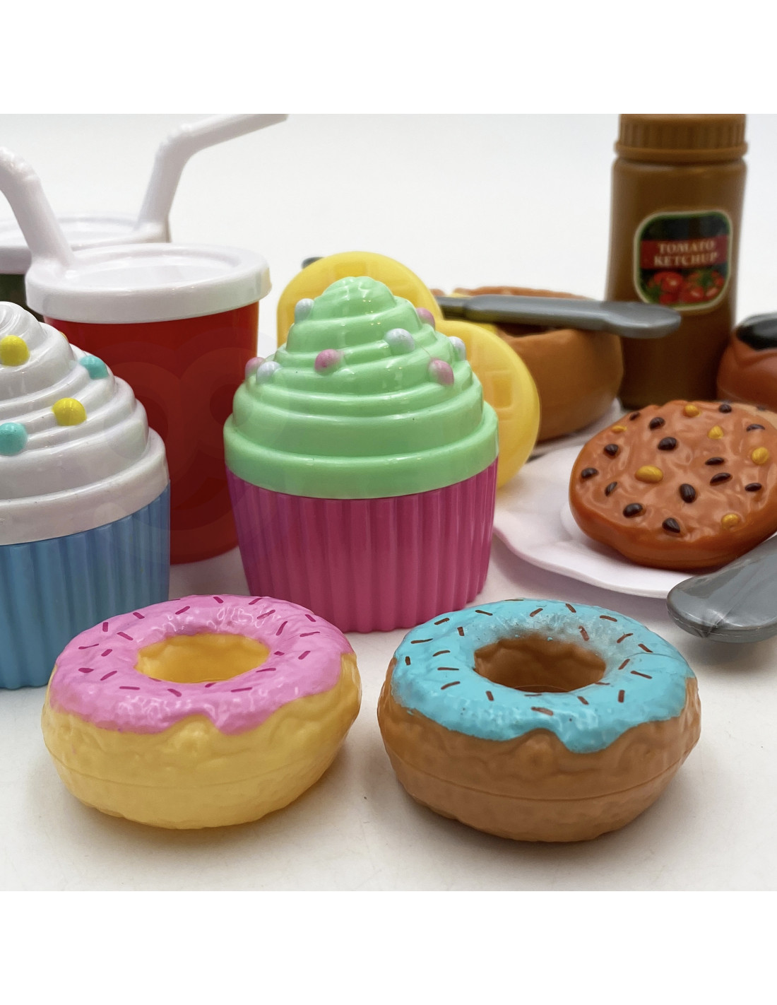 - - the set contains 18 elements : doughnuts, muffins, waffles, cookies, a roll, drinks, a tray, plates, spoons and sauce - a light bulb,