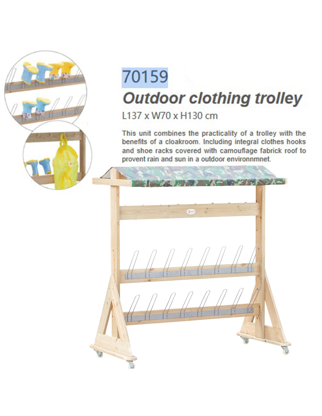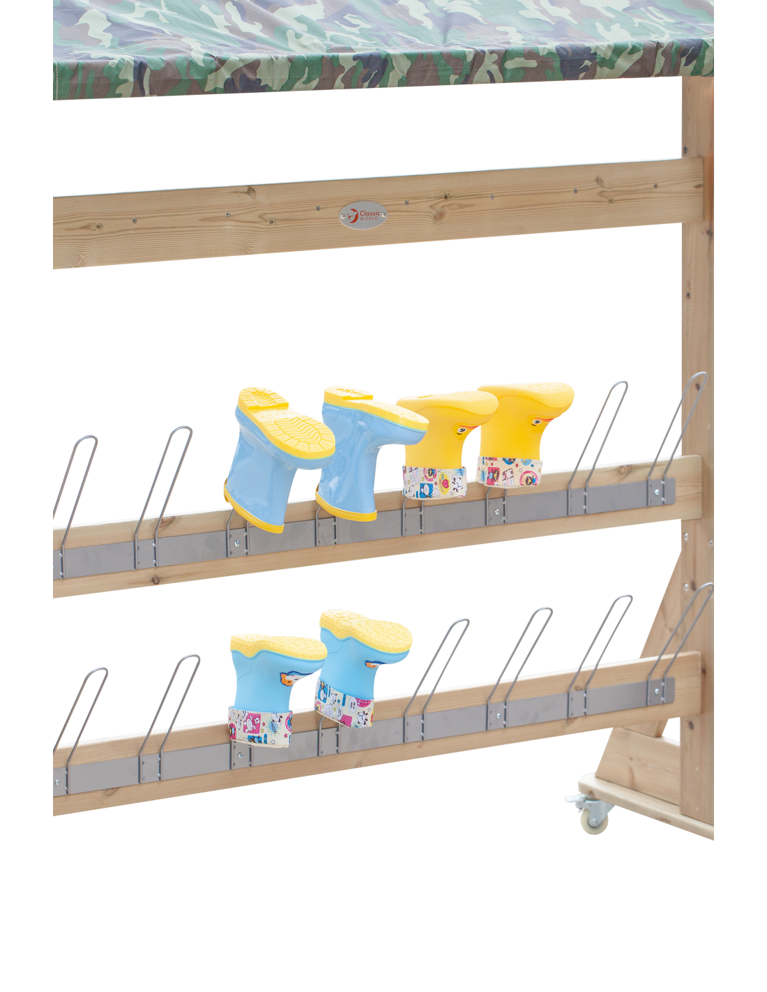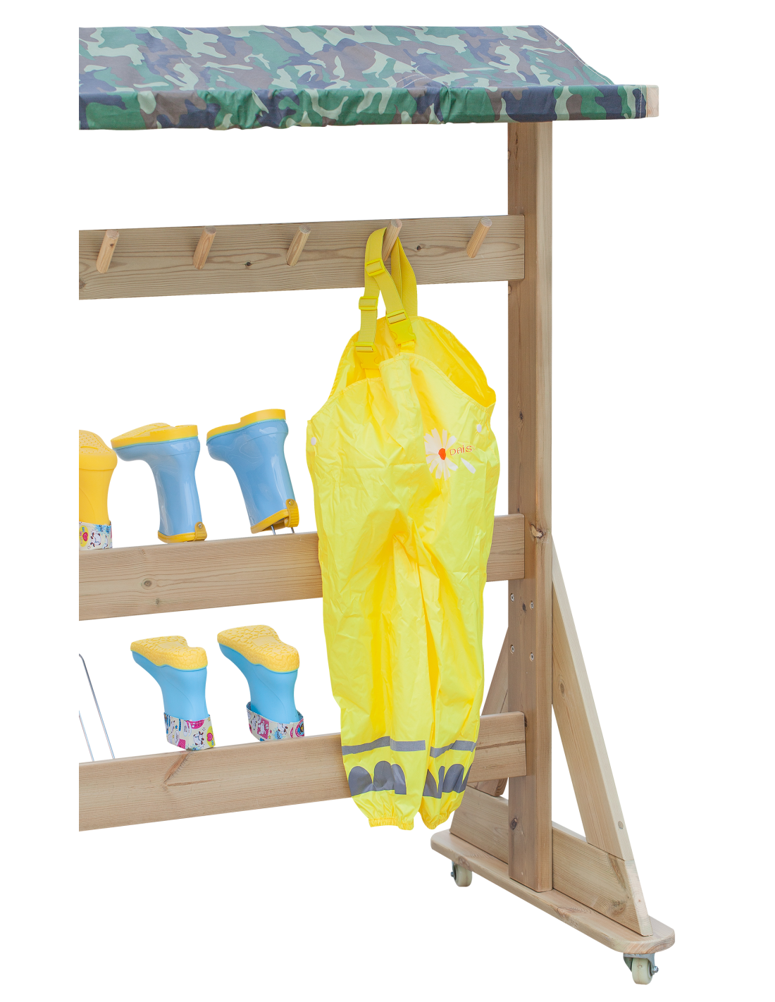 This hanger from the renowned Classic World brand is the perfect addition to any playground! Made of high-quality wood and finished with a non-toxic, child-safe impregnation , it can be used to hang items like wellies and raincoats. It features a camouflage-style canopy and wheels for easy movement. Ideal for institutions and beyond, this high-quality product is sure to impress.