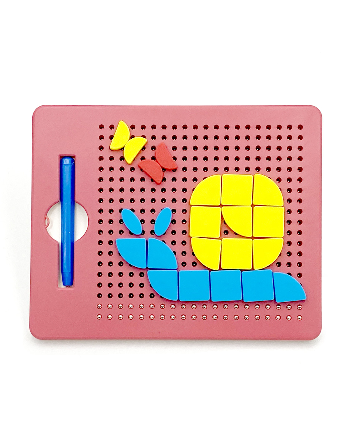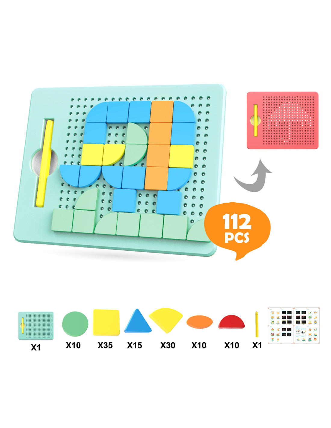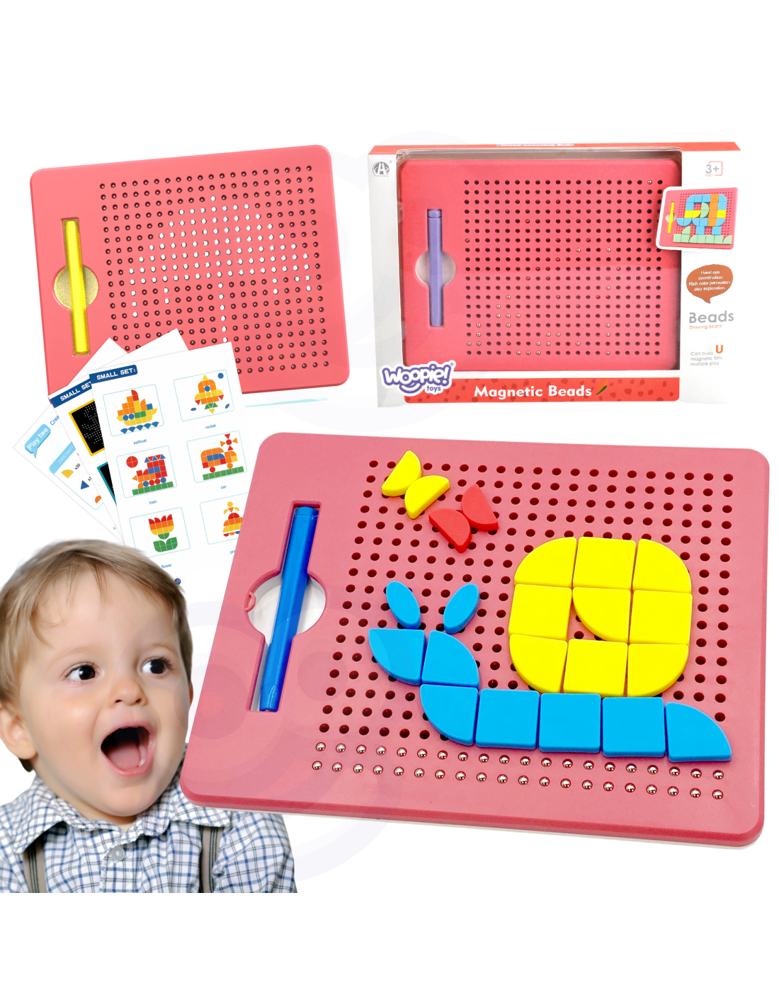 The Magnetic Drawing Puzzle from WOOPIE will captivate and fascinate your child. Children can draw on the board by attracting metal balls with a stylus. The set also includes blocks that can be easily placed on the magnetic board to create any pattern, such as an elephant . The included pattern booklet provides inspiration for assembling and drawing. The set contains 112 pieces. Simply assembling and drawing patterns will develop a child's logical thinking , imagination , and creativity , and will help them concentrate while creating. By arranging the blocks, children learn about shapes and colors and practice fine motor skills.