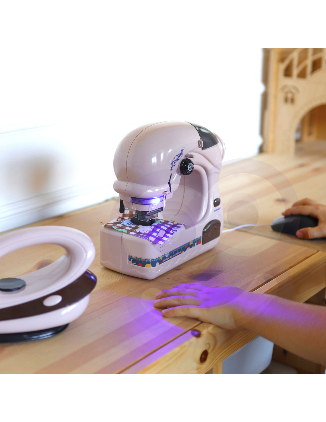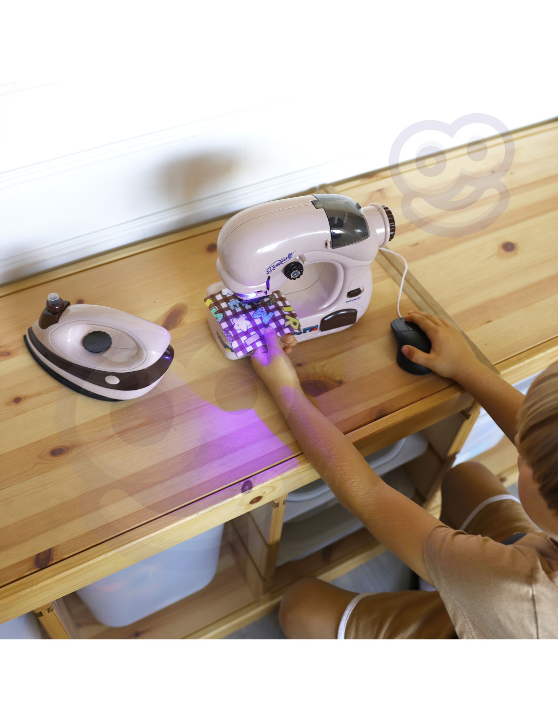 The sewing machine is operated using the included mouse. Once activated, it's sure to captivate children . The machine performs movements imitating a real sewing machine: the needle moves and punches holes in the fabric. A button activates the fabric illumination light . Additionally, a hand-sewing knob is located on the back of the machine. The set also includes fabric and two spools of thread.