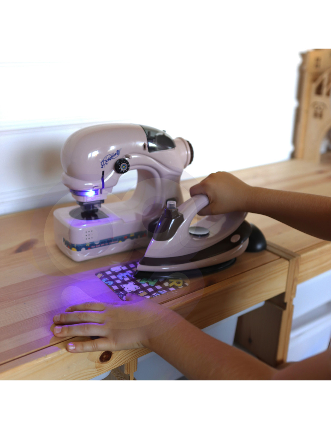 The 2-in-1 Small Home Appliances Set from WOOPIE perfectly imitates real-world appliances. The set includes an iron and a sewing machine . The iron is safe for children because it doesn't heat up. It's equipped with many features that add to the fun: a glowing LED light , vibrations, sound effects , and a spray function when the iron is filled with water. The toy also works without water. Thanks to a built-in sensor, the iron vibrates when placed on a flat surface and when moved across it .