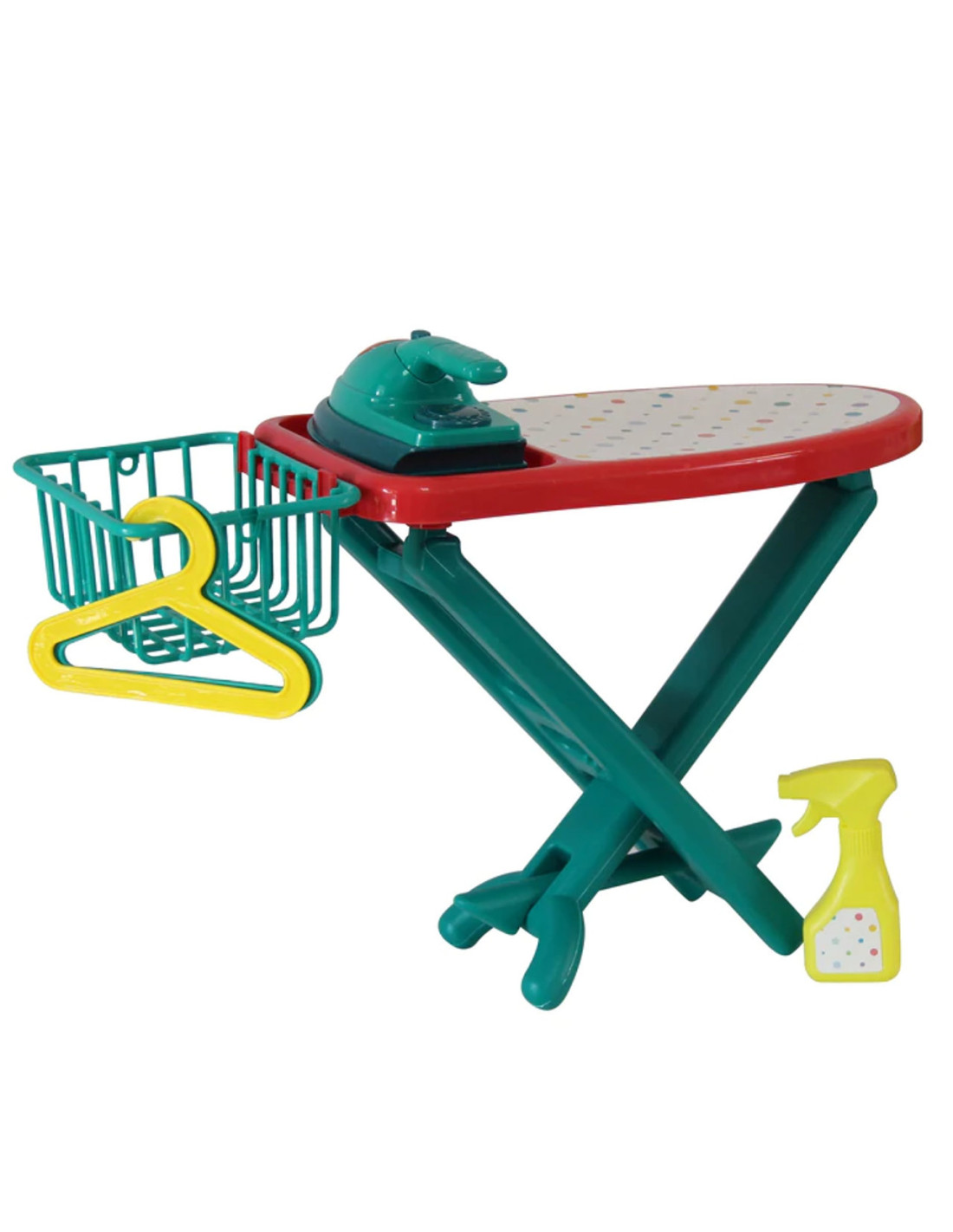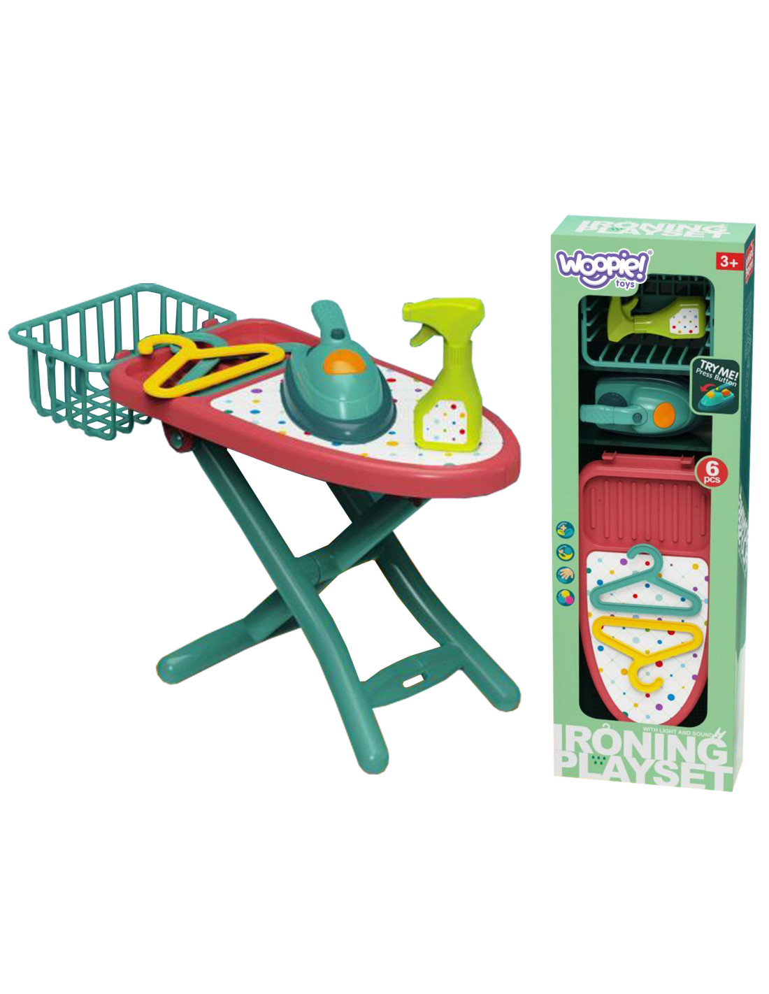The Ironing Set from WOOPIE will give your child tons of fun playing little housewife. The set includes an iron , ironing board, hanging clothes basket , two hangers , and a sprayer. The iron is safe for children because it doesn't get hot. The large button on the iron lights up when pressed. This is a perfect set for children who love to imitate their parents during everyday activities.