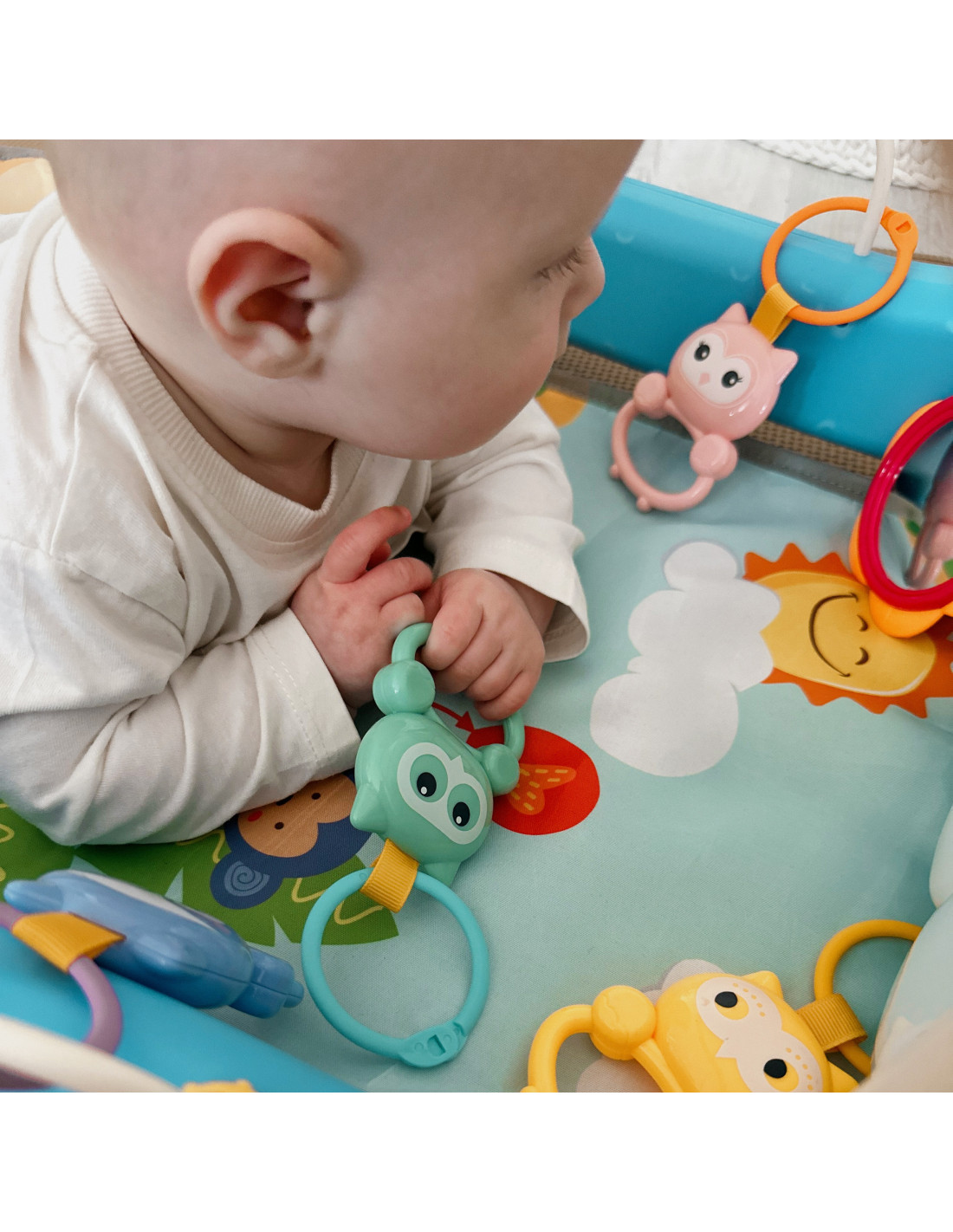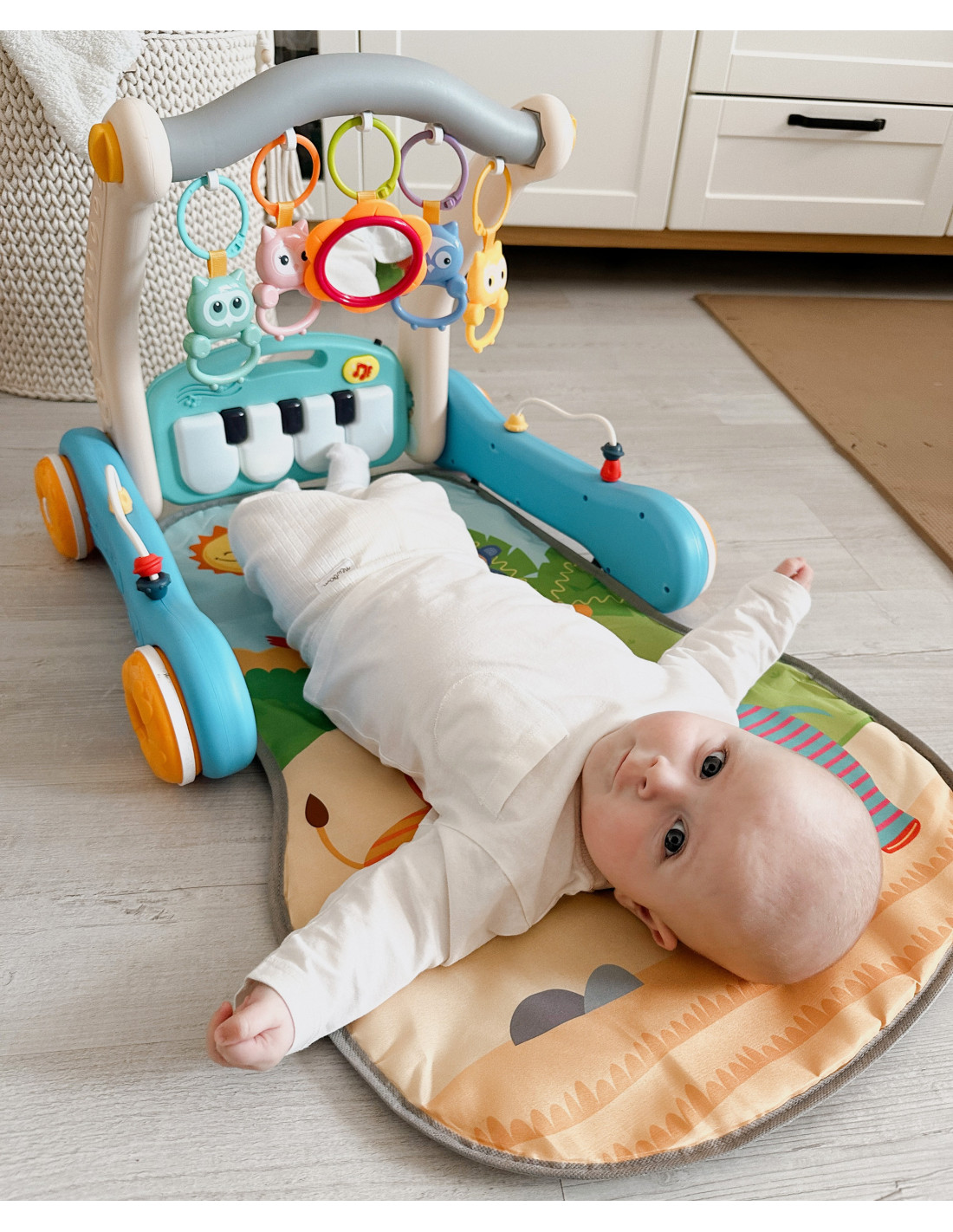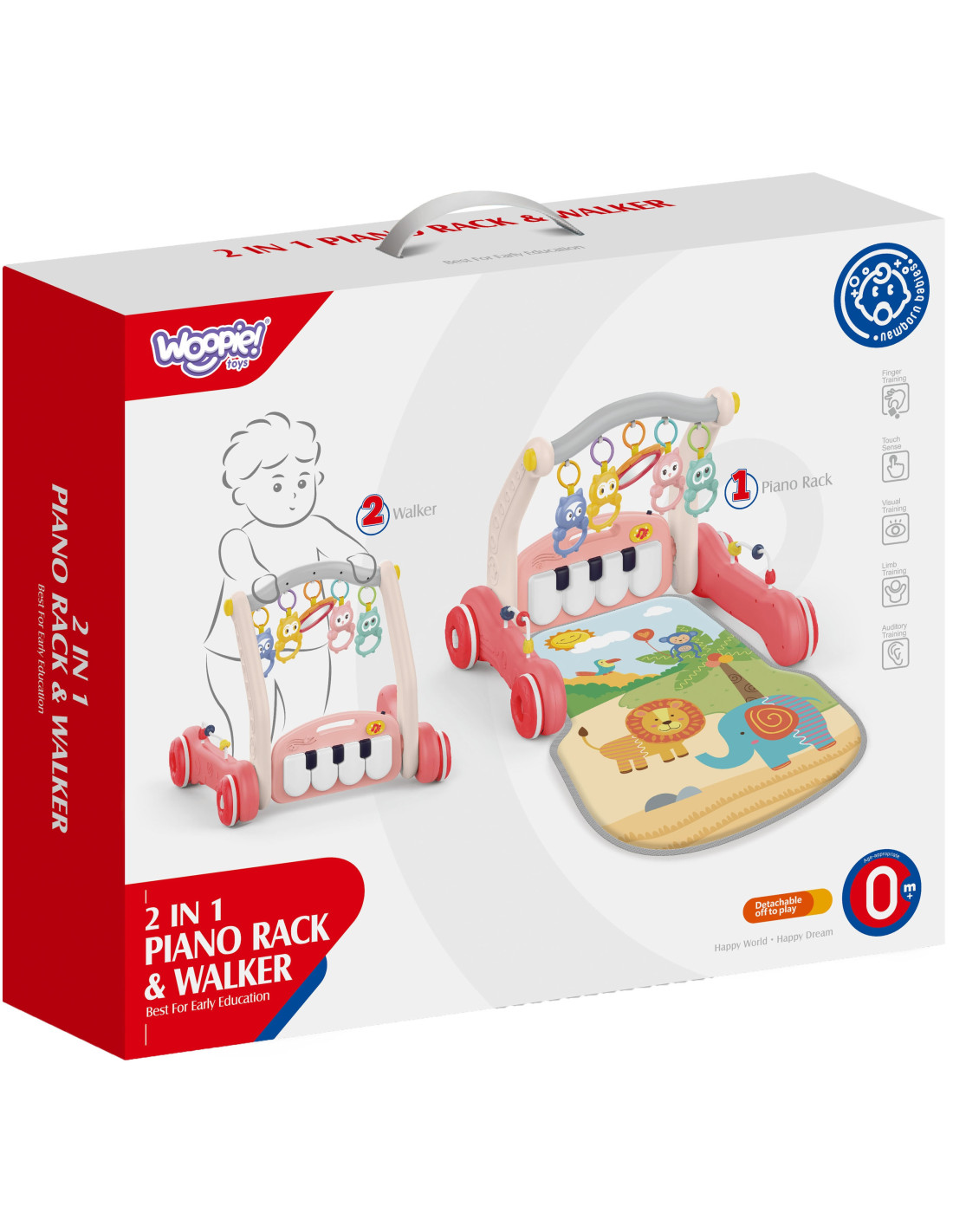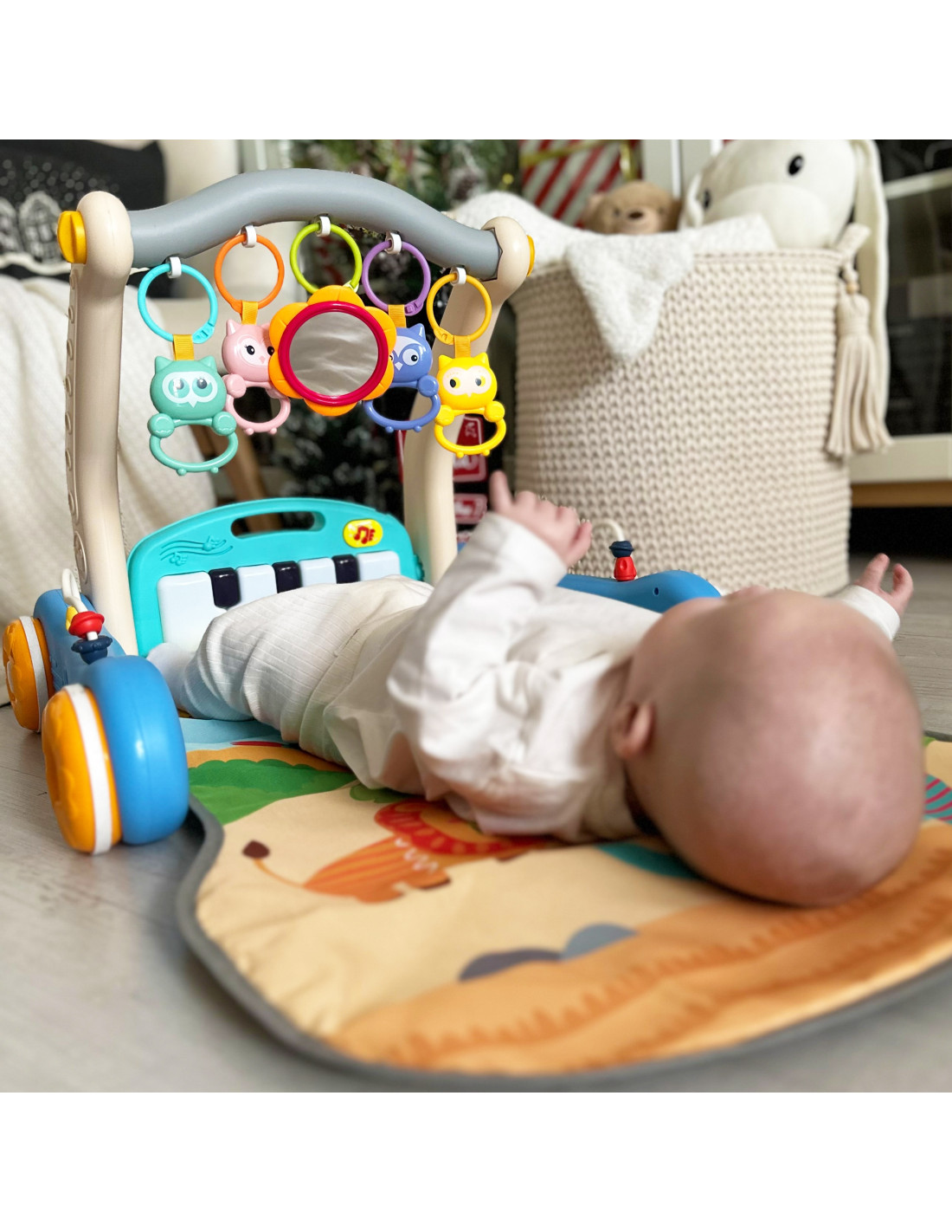 The Woopie 2-in-1 Play Mat and Pusher is a toy designed for babies from birth. Featuring a toy bar with colorful animal-shaped charms and a mirror, as well as sliding wheels, the mat positively impacts the development of all of your baby's senses. Our mat is a great place to relax, play, and explore the world. For babies taking their first steps, the toy bar can be used as a pusher/walker, while a piano panel with pleasant melodies will enhance play.