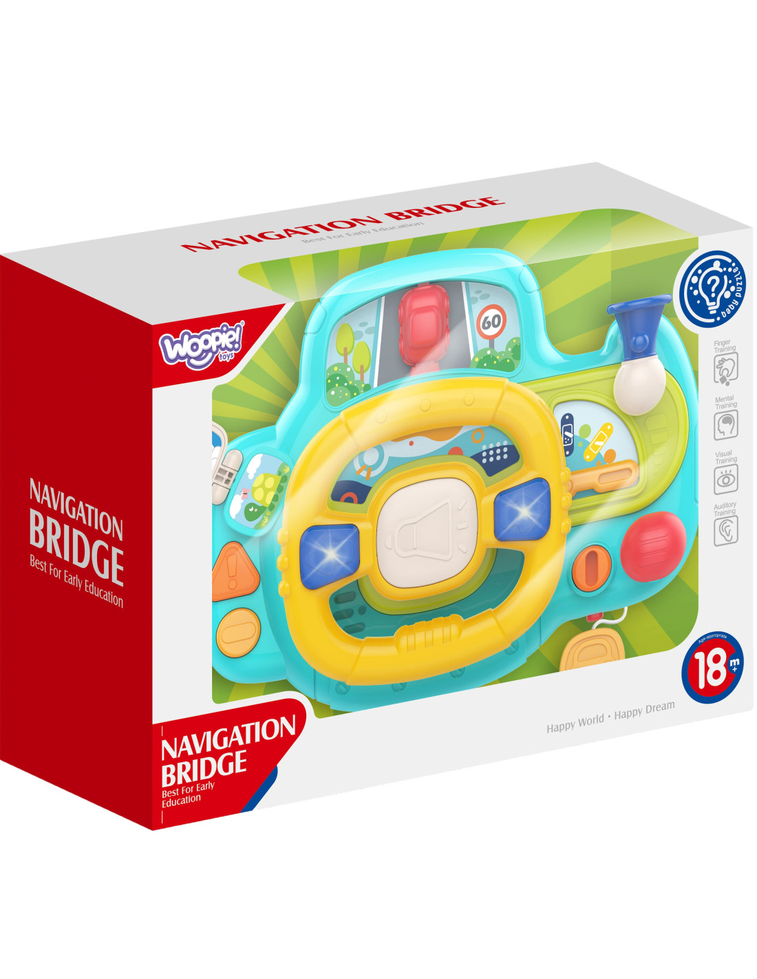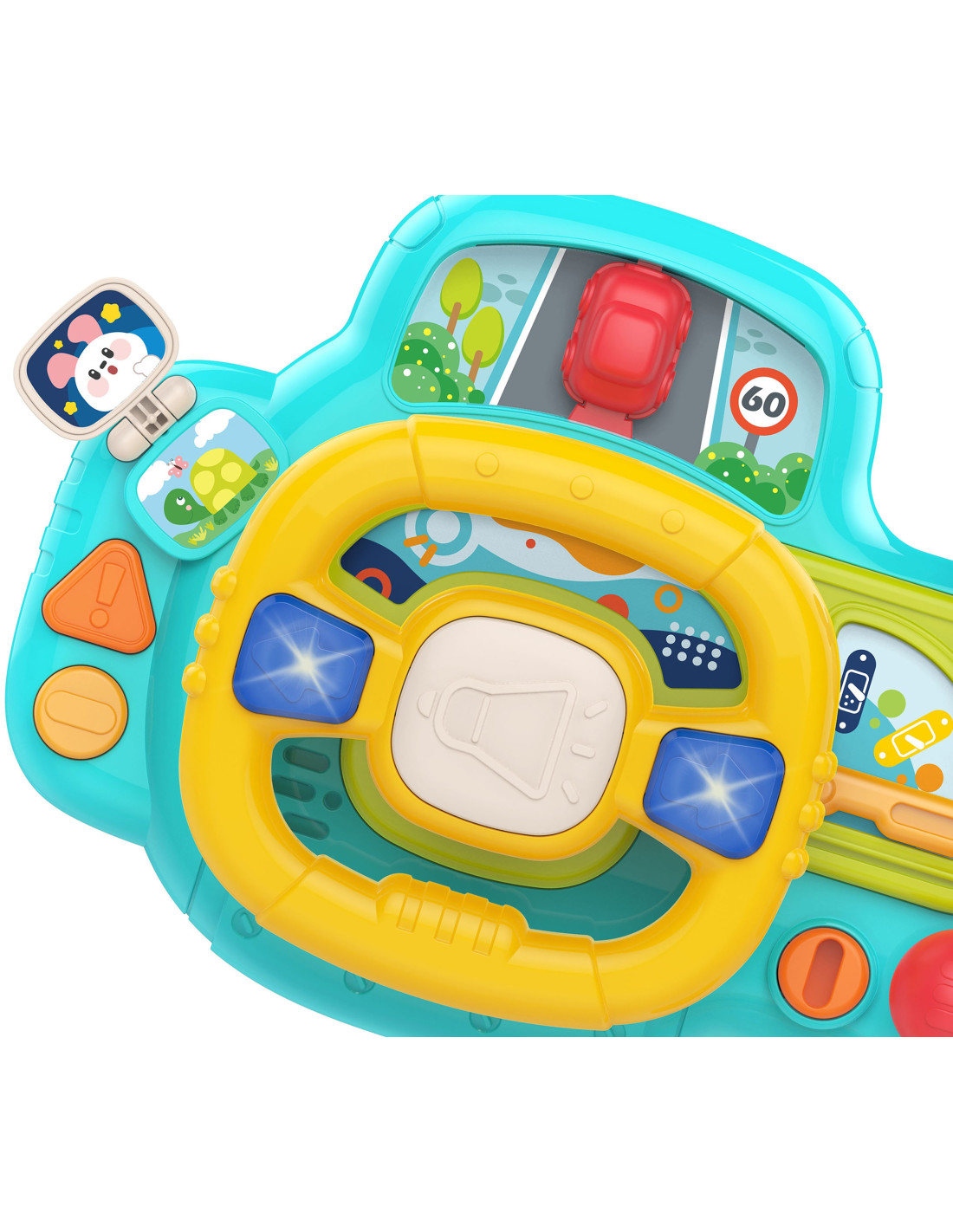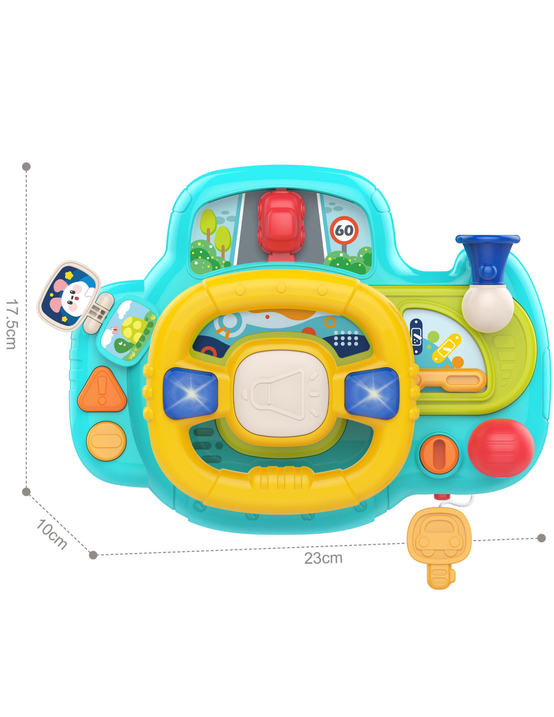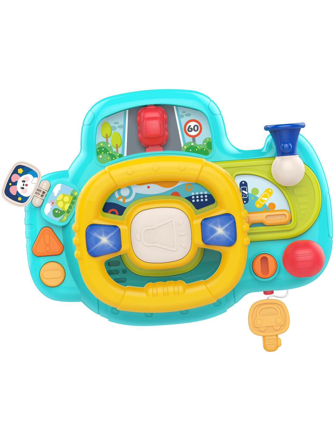 An electronic steering wheel , full of activity and fun, from the WOOPIE brand. This toy features buttons, lights, and sounds that simulate a realistic driving experience , engaging and stimulating your child's imagination. Turning the steering wheel moves the car, providing additional fun for your little one. The steering wheel with a control panel offers 11 functions , providing hours of fun. Additionally, the product can be attached to a crib, car seat, and many other places using seat belts.