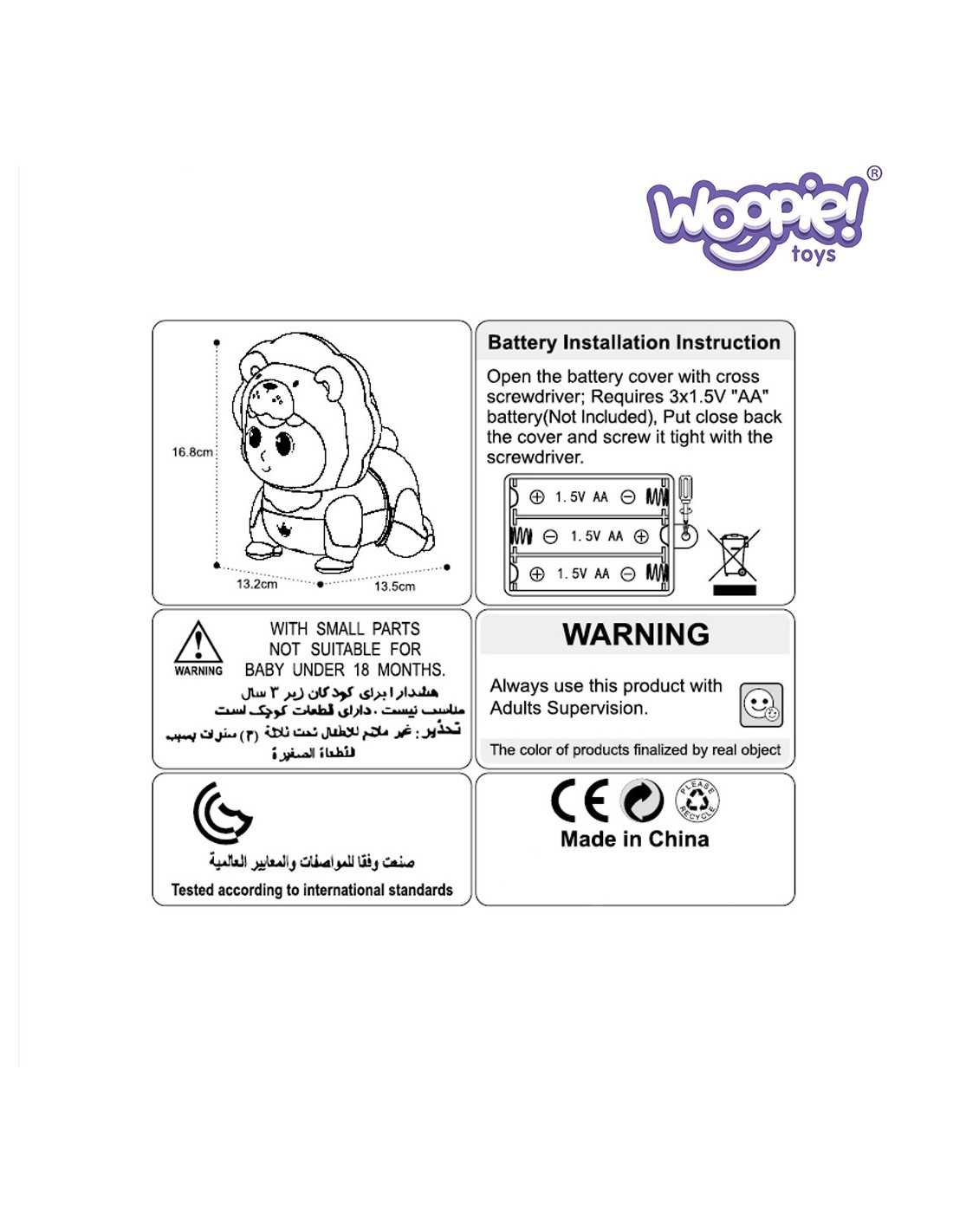 The Crawling Baby from WOOPIE is a joyful toy designed for children over 18 months of age. This toy encourages children to follow in its footsteps, which develops fine motor skills . To enhance playtime, the Baby features a melody that stimulates hearing and light effects that stimulate the sense of sight . The product is child- safe , has no sharp edges, and is made of durable plastic . It will make a great companion for your little one.