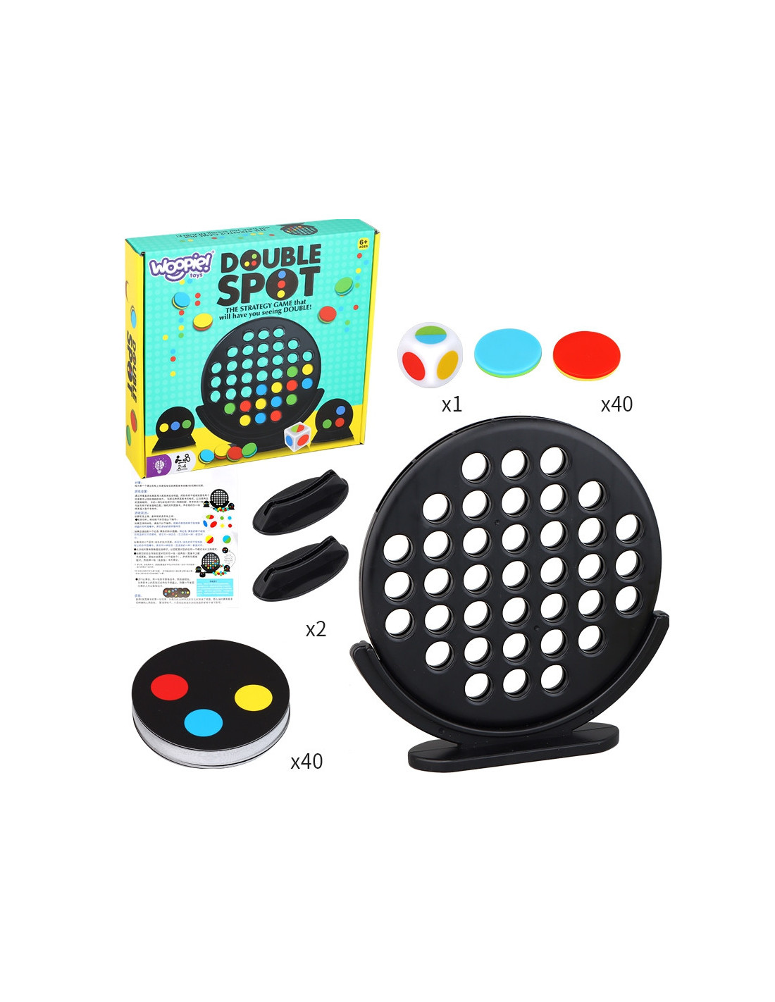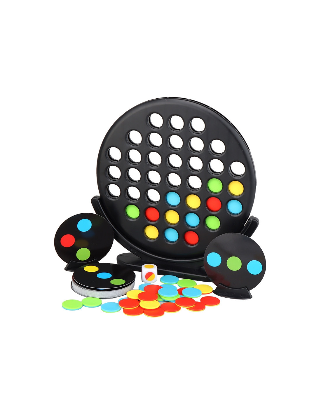 3-IN-A-LINE GAME from WOOPIE is a strategic and easy-to-play game. The rules are simple – find patterns on the card in any direction, match them, and collect the card. Players alternate placing tokens in any available space according to the color drawn from the die. The first player to win five cards is the winner. A game for everyone – children and adults!
