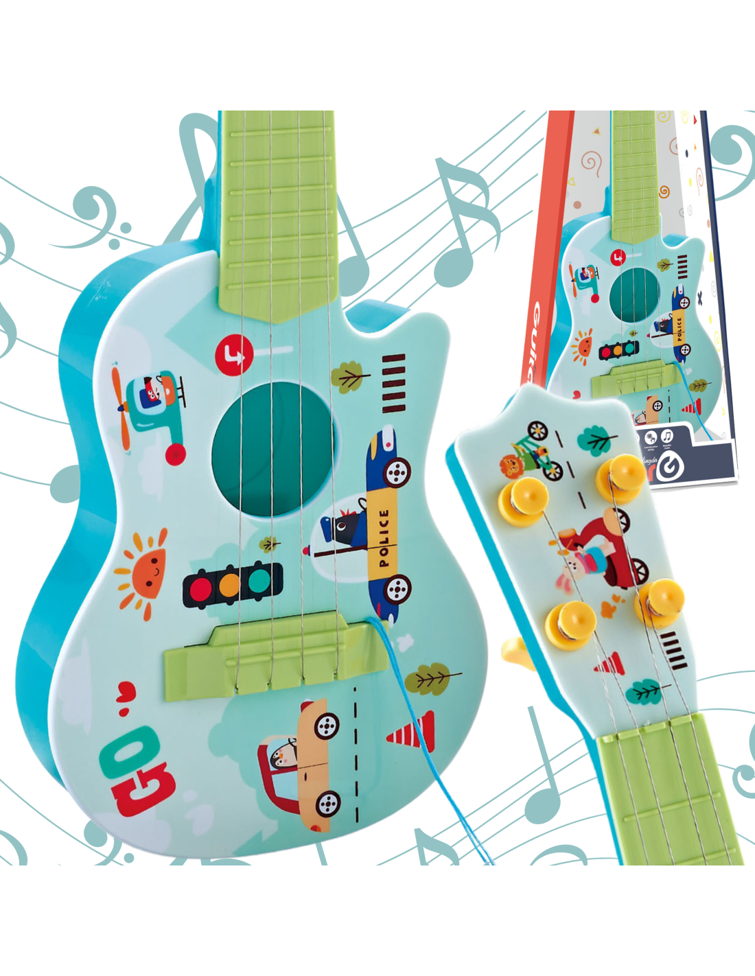 This guitar from the renowned WOOPIE company is a fantastic, colorful musical instrument for children with a beautiful animal print. It allows them to master their first chords, develop their passion, and, with a little patience and imagination, even play a home concert. It's a perfect product for exploring children's early fascinations with the world of music. Little fingers practice running along the fretboard, which significantly improves manual dexterity and teaches concentration and perseverance. It perfectly imitates a real instrument. A true hit in the fun-through-learning category.