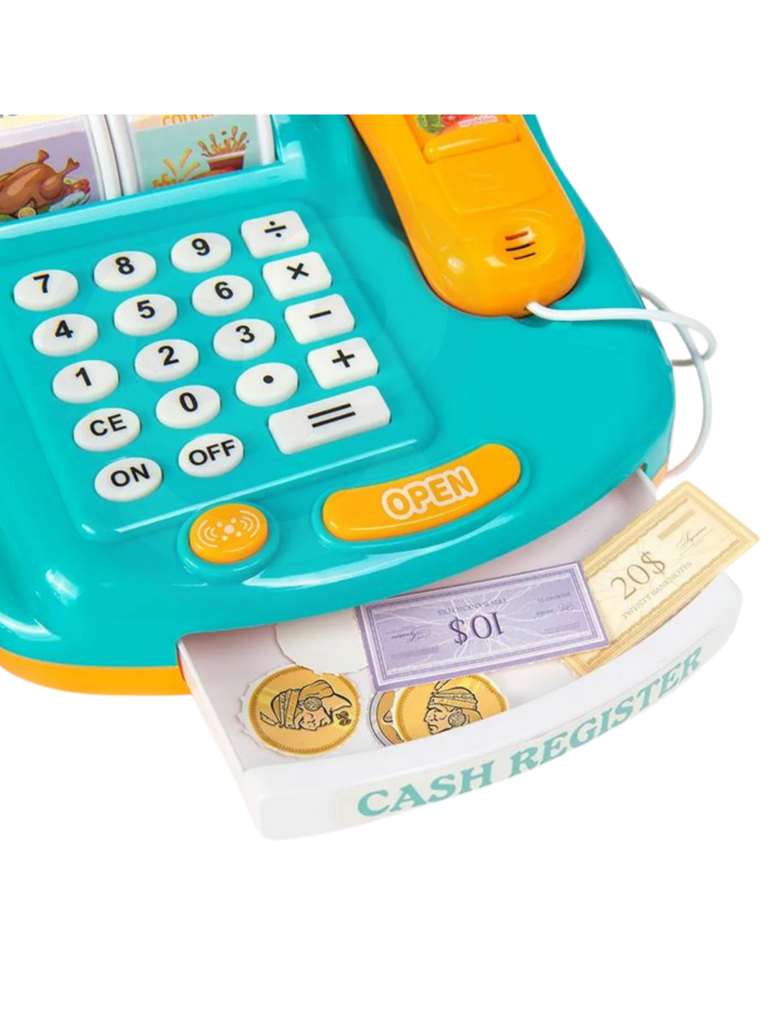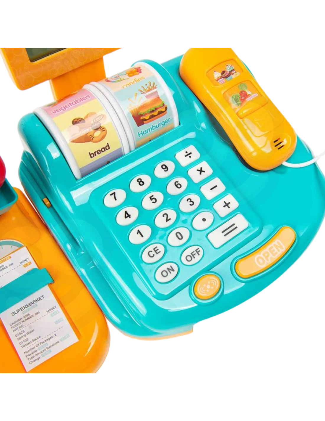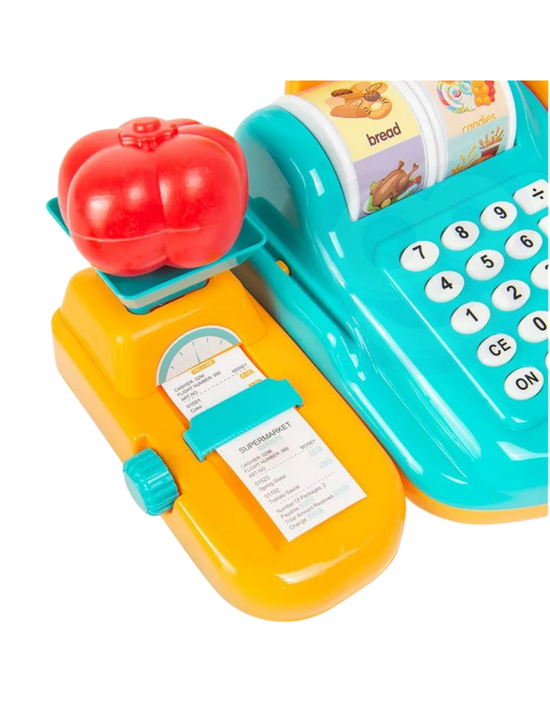 The WOOPIE Store Checkout with Shopping Basket is an electronic cash register equipped with a sliding drawer, barcode reader, card reader, scale, and receipt printer. This unique toy combines fun with learning, stimulating children's imagination, developing creative thinking, and role-playing skills. The cash register features a large display.