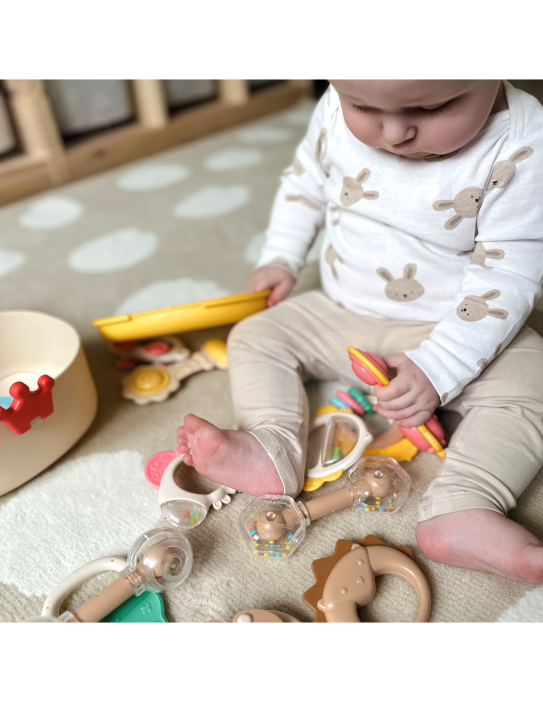 - - the set includes a variety of rattles of different shapes and textures,