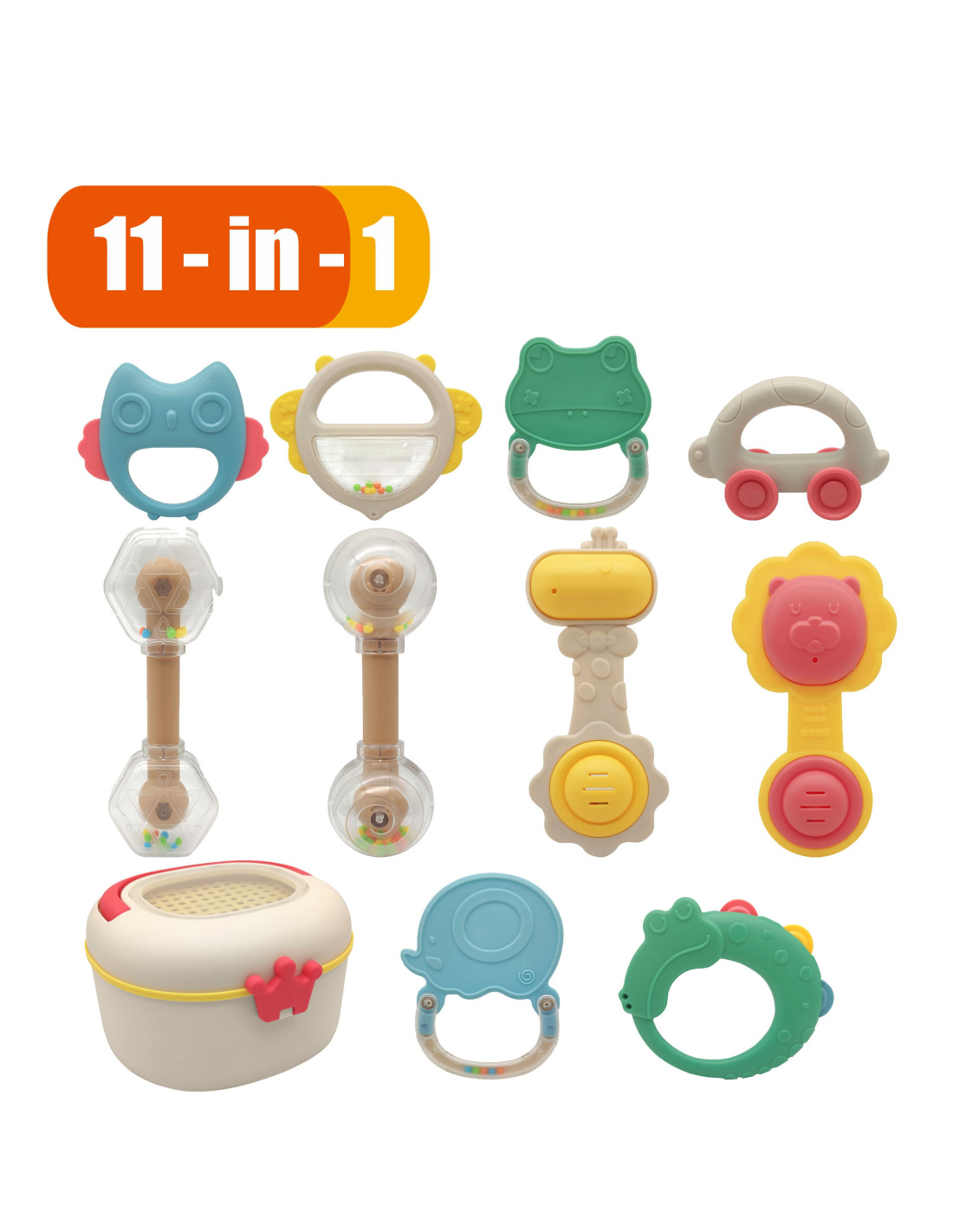 - - 14 different rattles in the shape of animals.