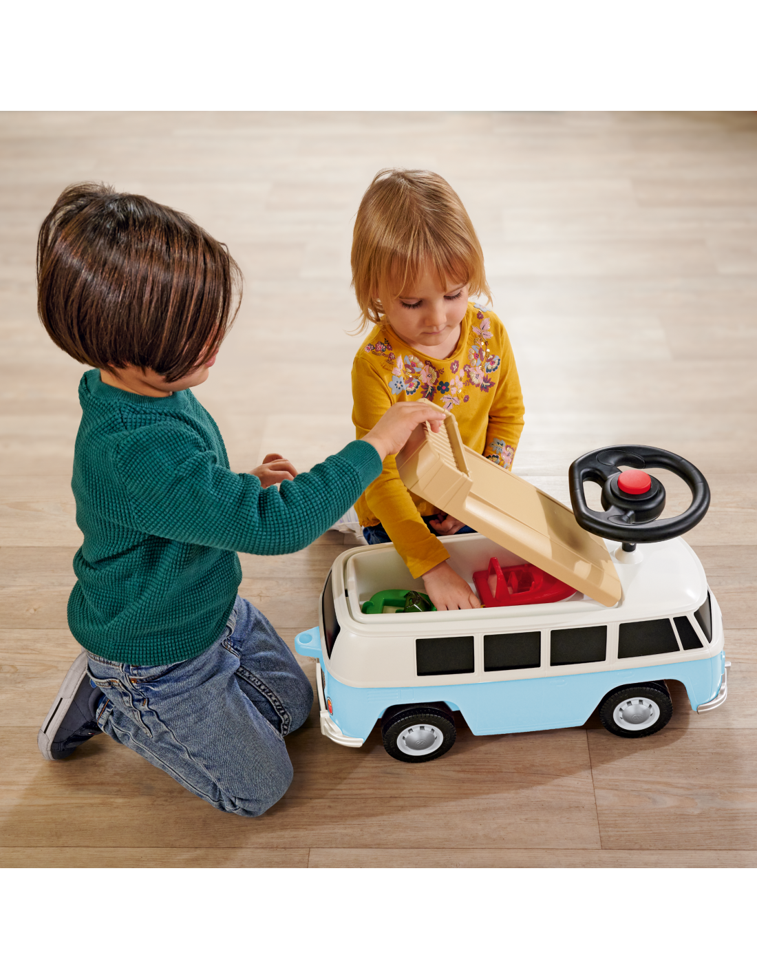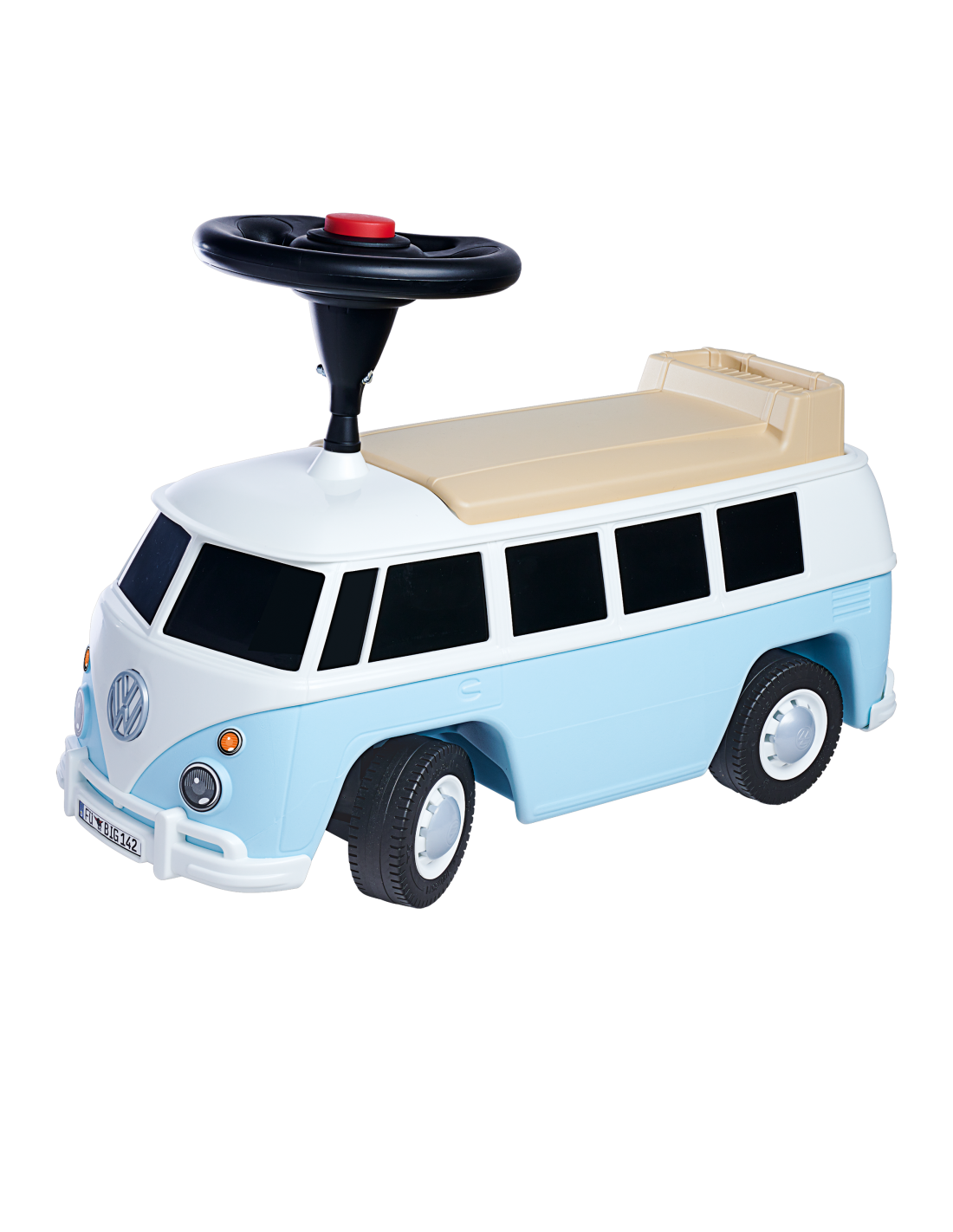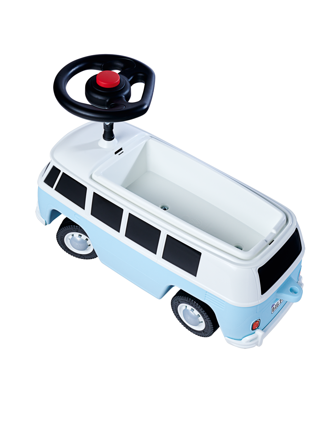 The Ride-On Van from the renowned BIG company is a vehicle resembling a real Volkswagen . It's stable and safe – perfect for children just starting their adventure with vehicles. The removable roof reveals a spacious interior that provides enough space for play figures and dolls up to 12 cm tall . They can accompany little adventurers on their trips and are always ready to keep them company during short rest breaks. The van is also equipped with high-quality, quiet wheels , which are especially popular with parents and allow little drivers to cruise around gardens and children's rooms. Thanks to the exceptionally soft, non-marking plastic tires, there's no risk of leaving marks on the floor, making the ride-on ideal for indoor use. The ride-on is built so that children can try out and develop new skills – getting on, off, pushing, and steering. It's an ideal gift for children aged 2 and over .