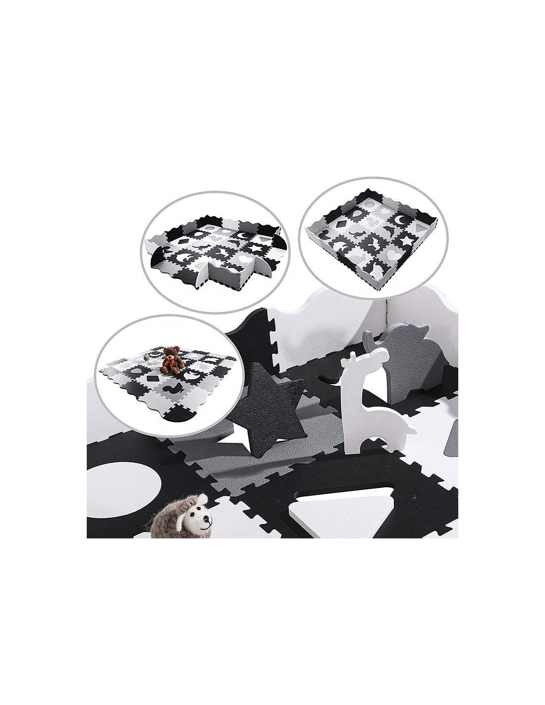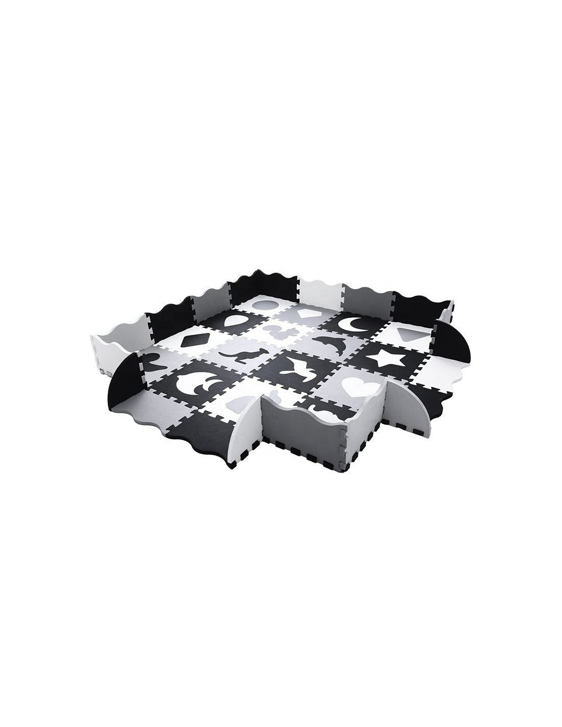 The Woopie Foam Play Mat is the perfect choice for parents who care about their child's safety and comfort. This set can be assembled in three different ways : as a classic play mat , a playpen , or a playpen with a door . Its puzzle-like design gives parents complete freedom in adjusting the size and shape to the specific room space, making it an ideal solution even for small or narrow spaces.