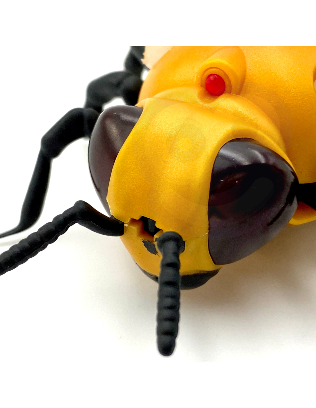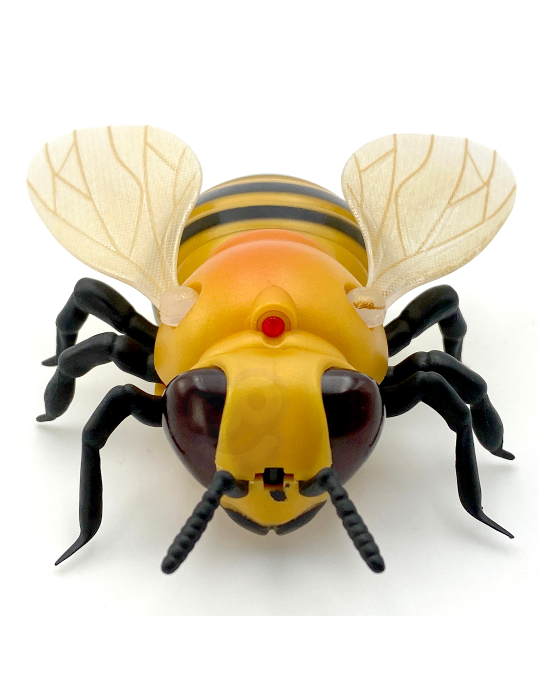 The Remote-Controlled Bee by WOOPIE is a remote-controlled bee robot designed for children aged 6 and over. The robot is colorful, with distinct black and yellow stripes imitating the appearance of a real bee. The wings are transparent and detailed, resembling the structure of an insect's wings. Control is via the included infrared remote control.