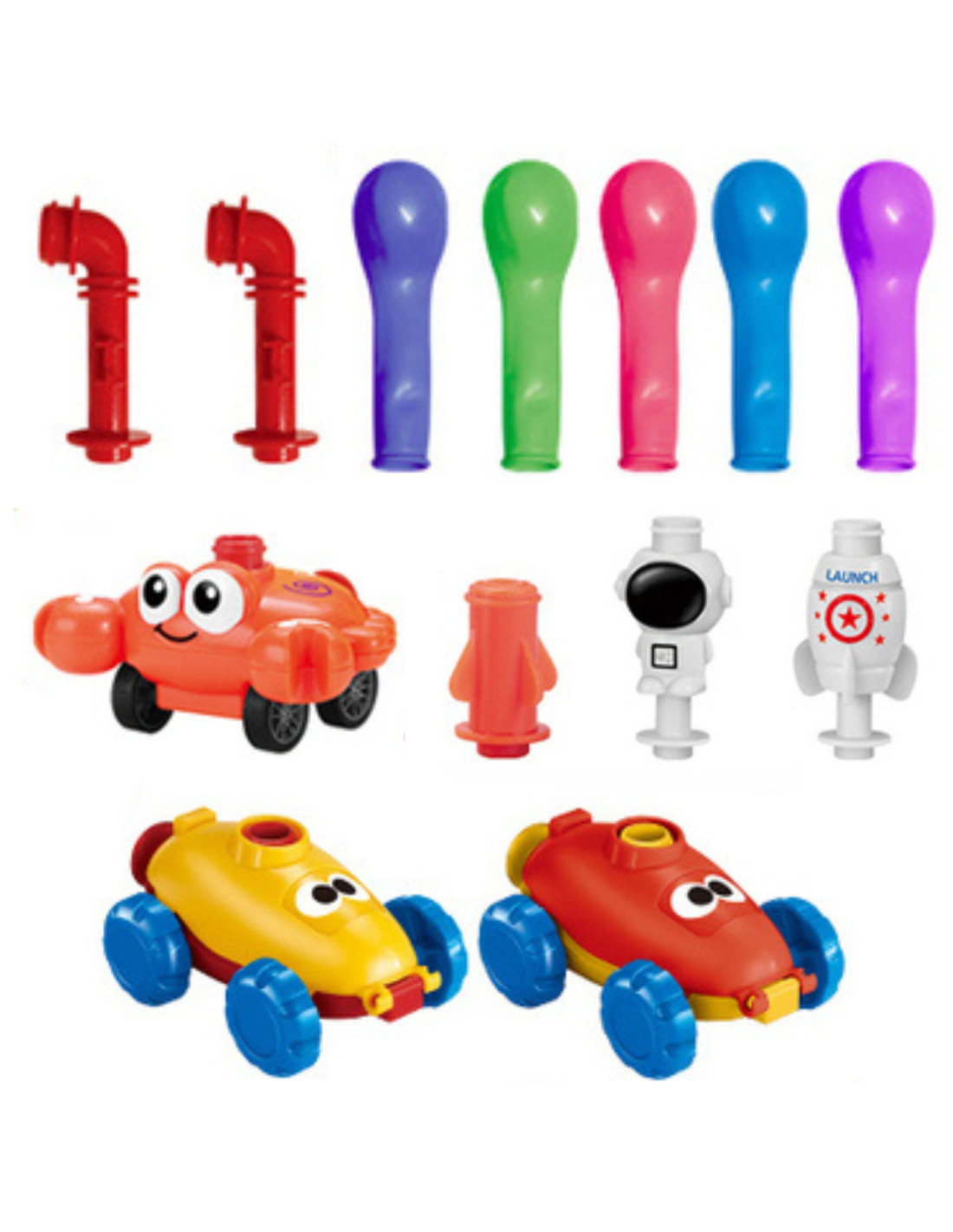 We attach a smaller element to the main pump, then place the astronaut with the balloon on top. Then, simply start pumping and press the button to disconnect the figure from the pump, and he'll fly! The second application is to connect the balloon car to the pump and launch it into a race. No batteries are needed for this activity.