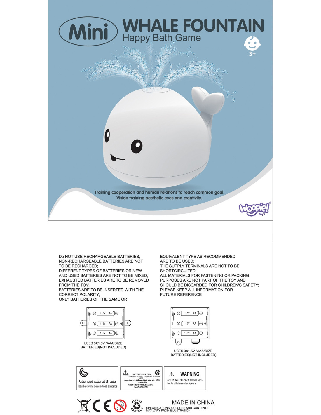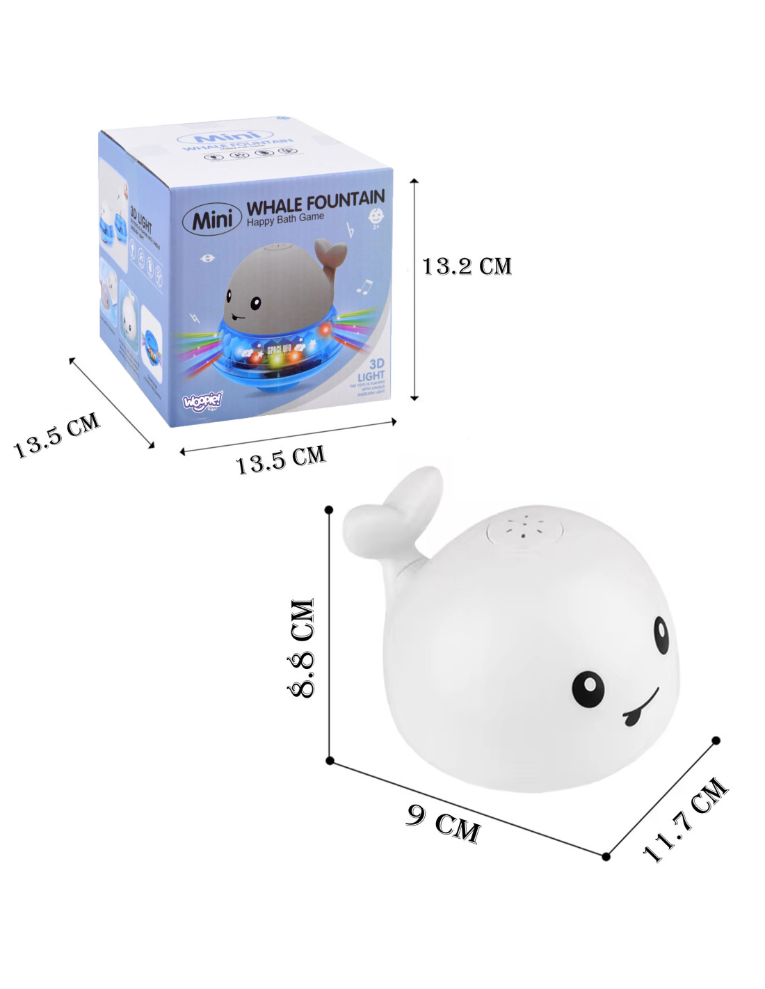 The WOOPIE Light-Up Whale is the perfect gift for your child to make bathtimes magical ! It's not only a charming addition to any bath, but also a source of endless fun and joy for little ones out of the water! Designed with safety and comfort in mind, the whale guarantees an incredible playtime experience. The toy is made of durable ABS plastic, which is not only safe but also damage-resistant. Designed with safety in mind, the rounded edges protect baby's delicate skin. The water toy features an automatic recognition function. As long as the toy is placed in the water, it automatically recognizes it from below and sprays a column of water at the appropriate height . When it exits the water, all effects immediately stop. No manual operation is required. (Note: When not in use, disassemble the toy into two pieces and wipe it dry.) The whale is perfect not only in the bathtub but also for play outside. Its charming design and functionality make it a favorite toy for every child.