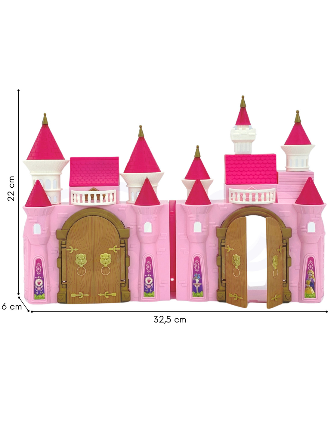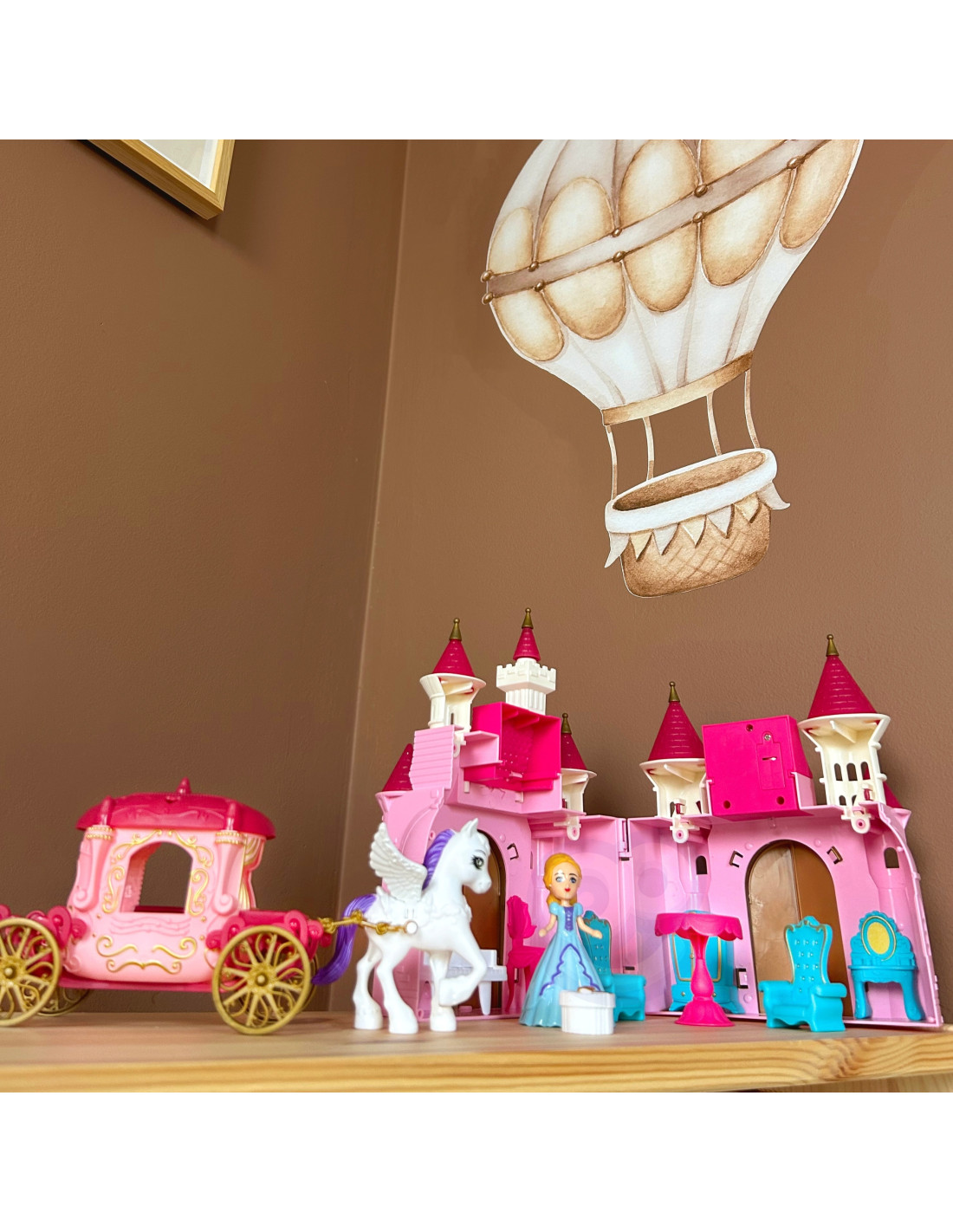 The amazing Princess Palace playset from WOOPIE will take your child to a world of princesses and magic while playing. The set includes a beautiful pink, foldable palace and furniture that perfectly complements the elegant décor. The princess figure has beautiful blonde hair and an evening gown – she's sure to delight your child! The set also includes an adorable Pegasus horse with an attached pink carriage. The palace is interactive – it features light and music functions.