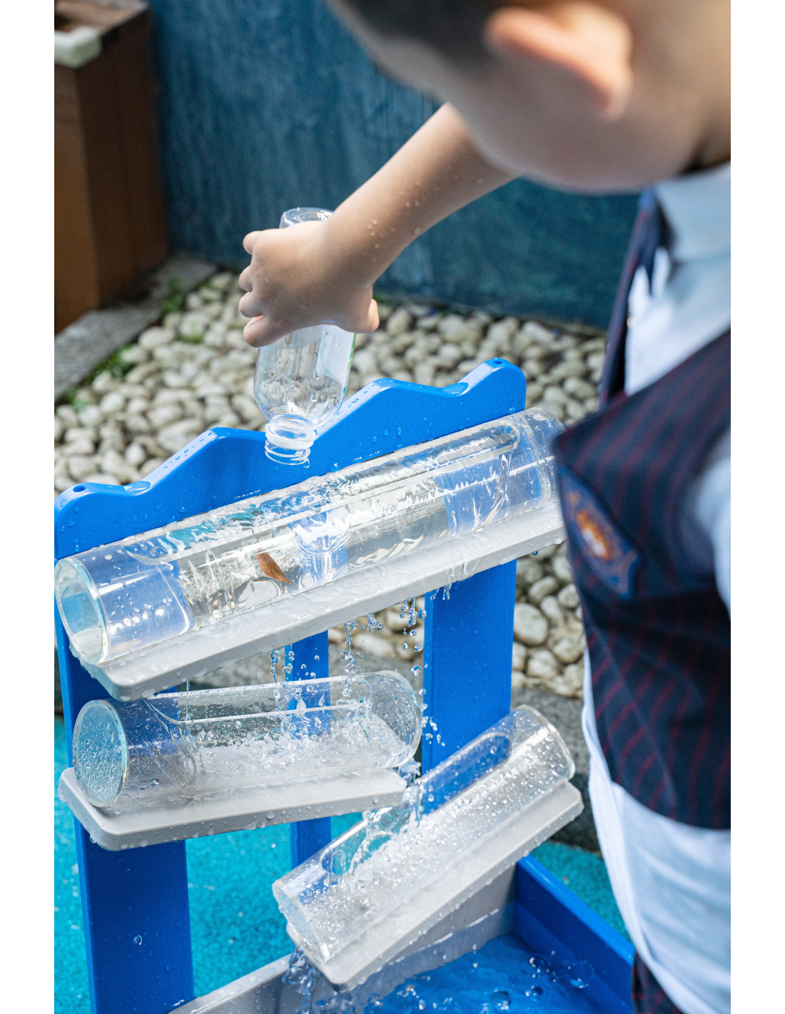 the other two tubes. This activity helps develop children's understanding of the fluidity of water, sand, and marbles.