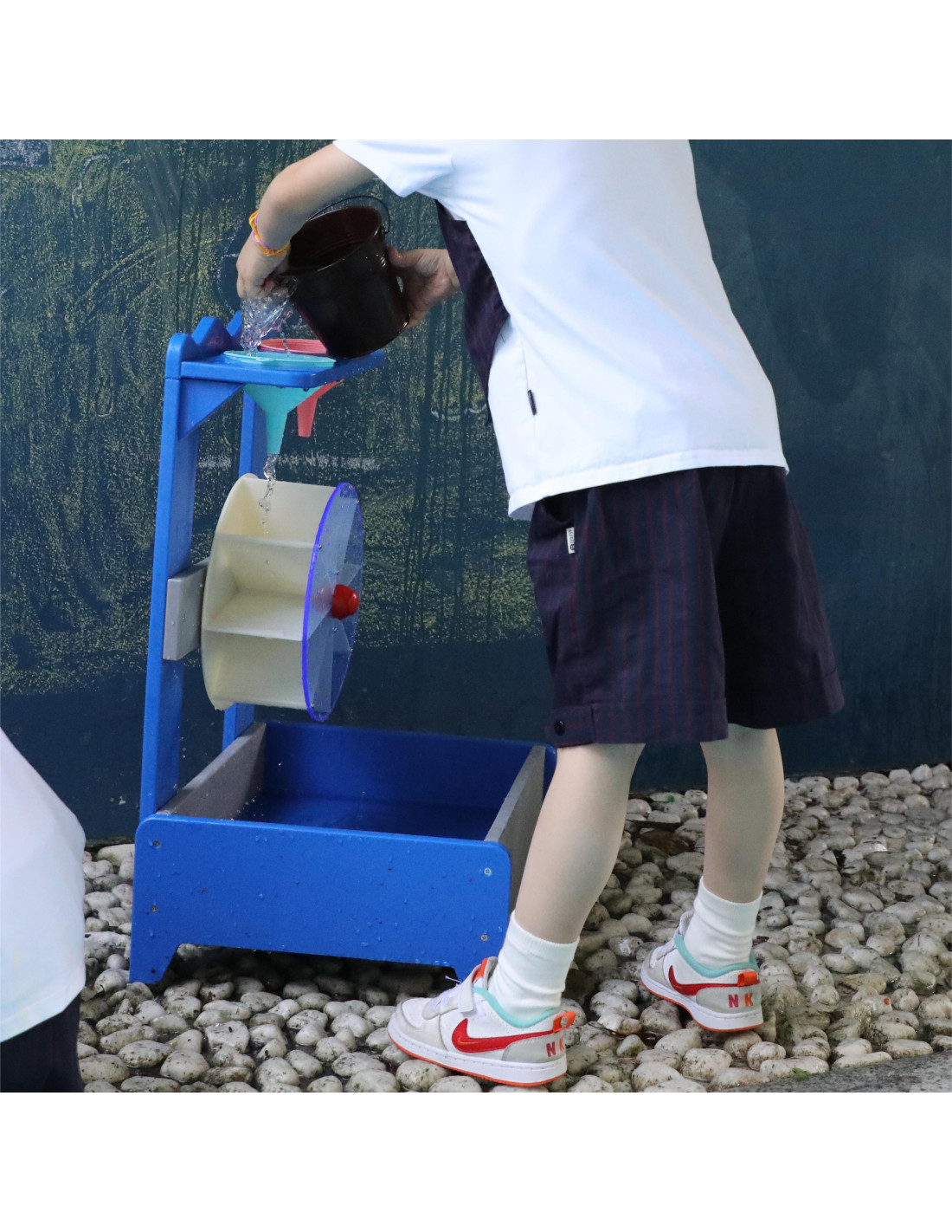 - - Experimental set - the child learns the cause-effect sequence, observes the water that sets the mill in motion.