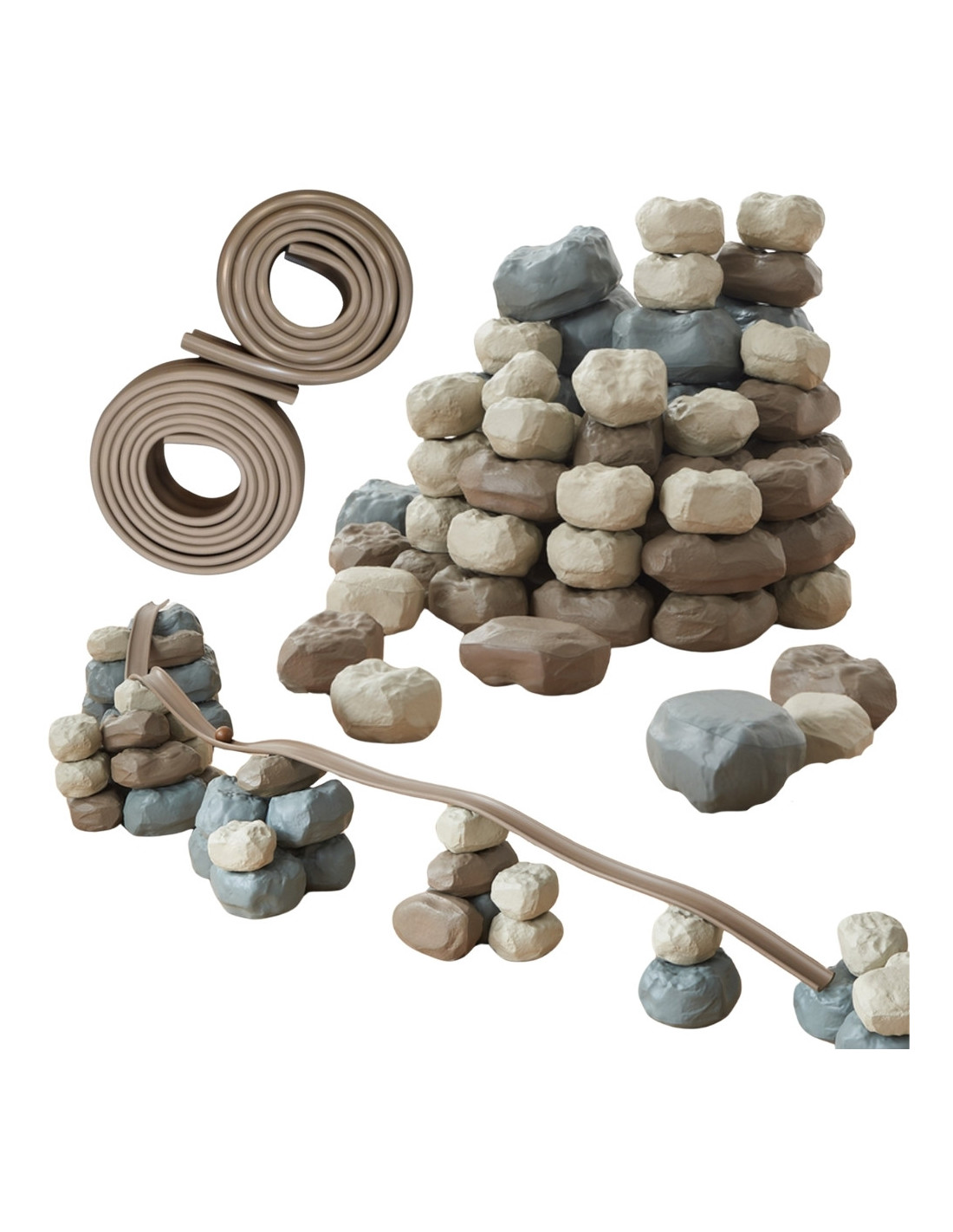 The Flexible Ball Track is a lightweight, safe construction element made of flexible plastic. Designed for creative play, it allows for the construction of supports, obstacles , and a variety of structures for racetracks and gravity experiments . The stones can be freely arranged to create unique tracks or structures to support the flexible track. It's ideal for solo or group play, encouraging collaboration and creativity.