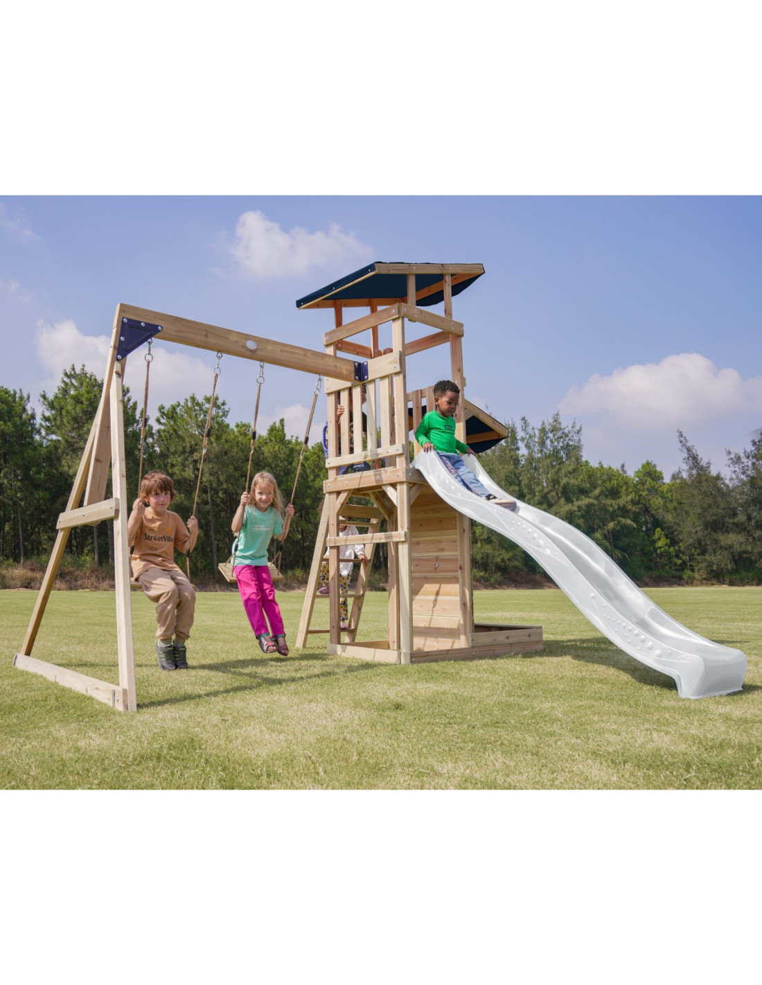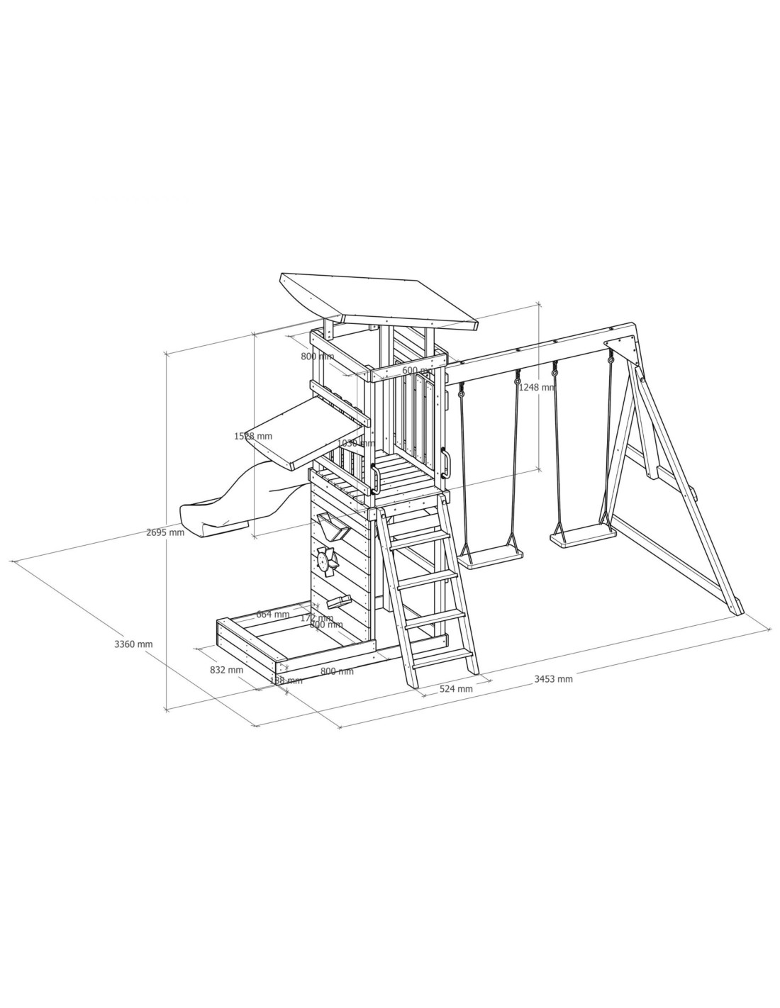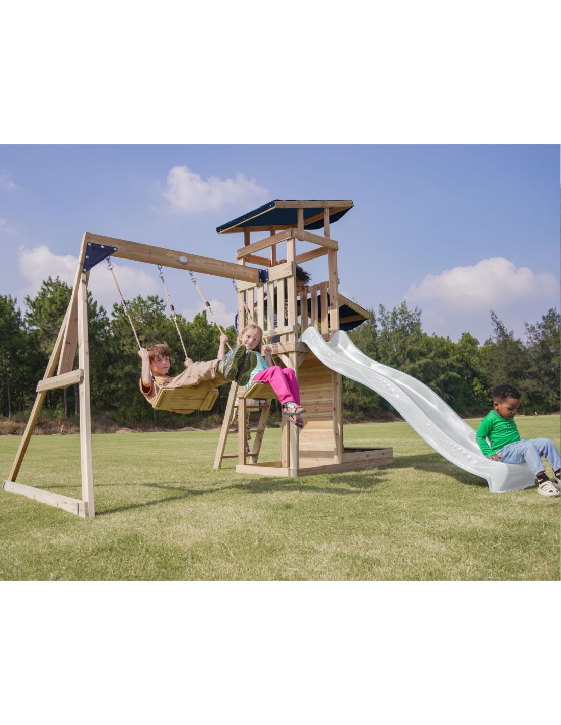 ✔ Thanks to a variety of elements – an observation tower, a long slide, a double swing and a sandbox – children can develop their creativity, strength and motor coordination in one place!