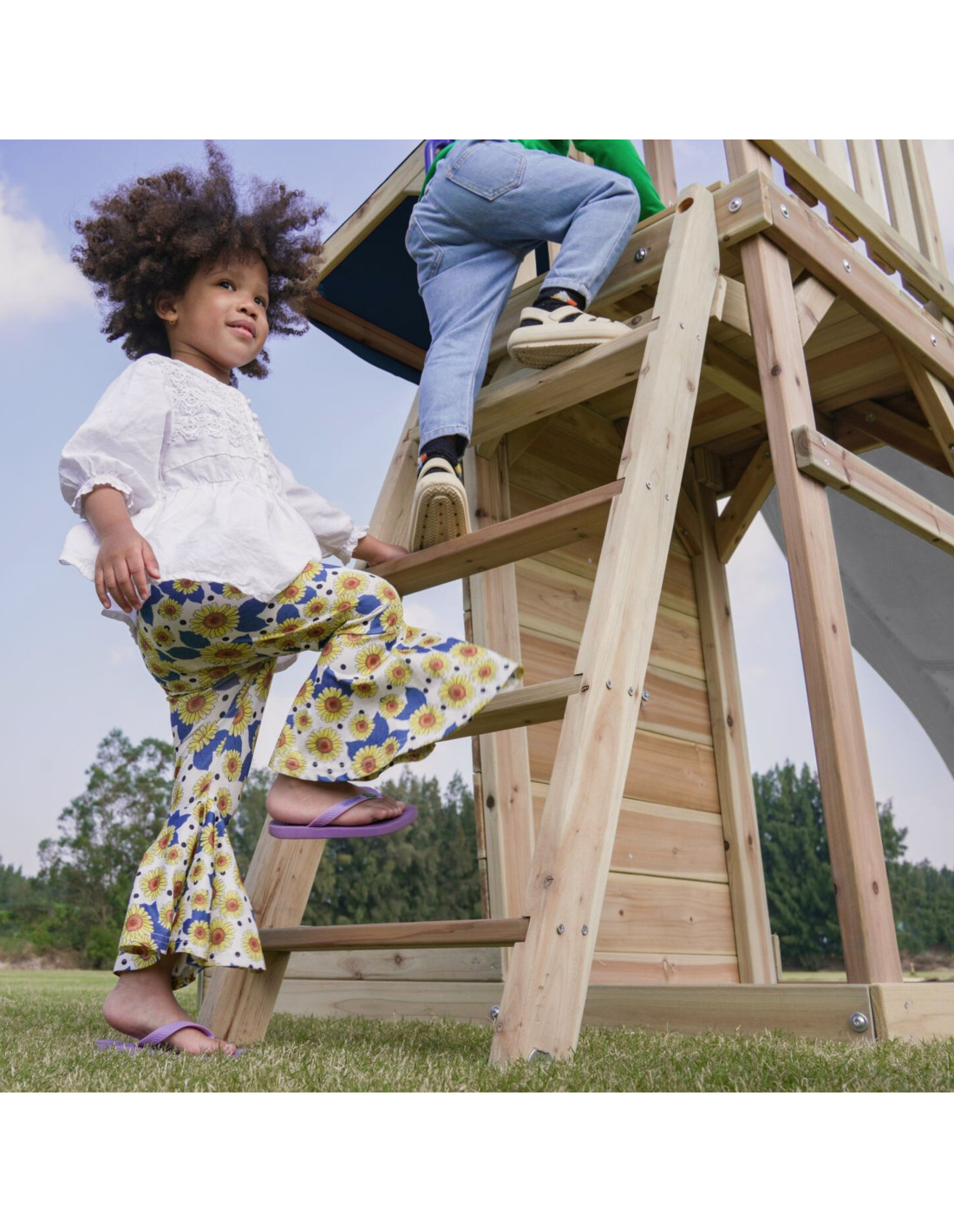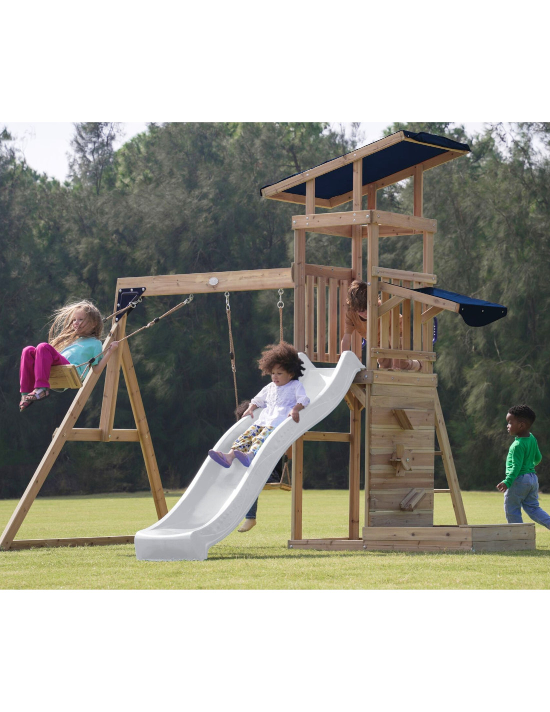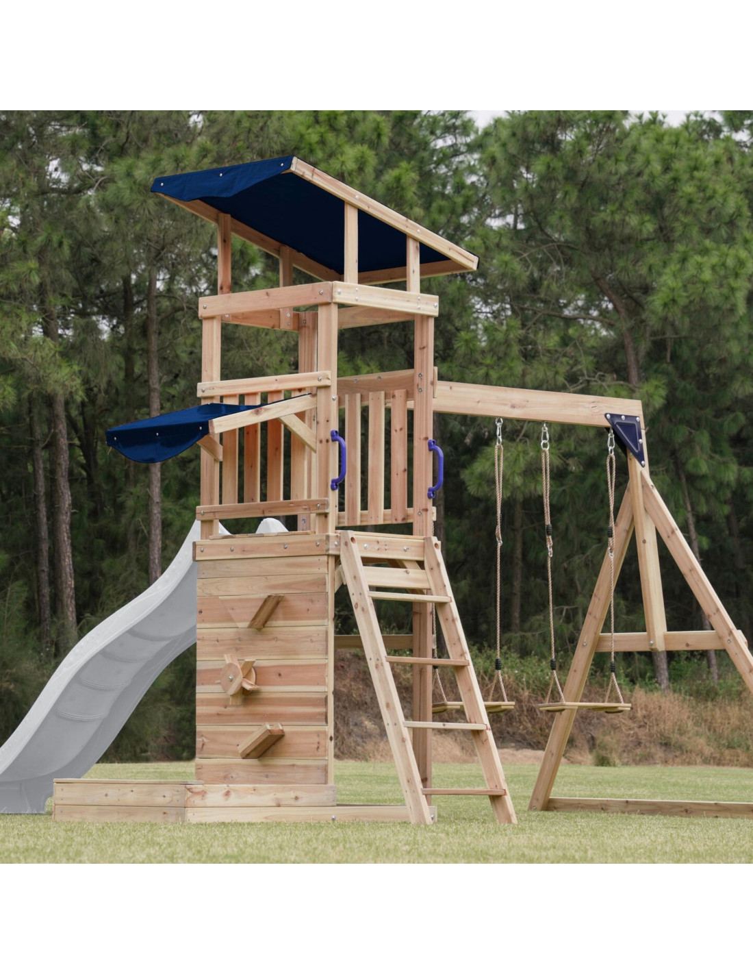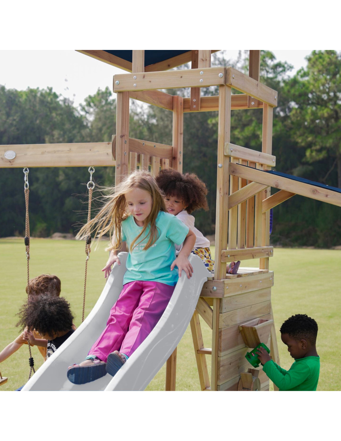 ✔ Thanks to a variety of elements – an observation tower, a long slide, a double swing and a sandbox – children can develop their creativity, strength and motor coordination in one place!