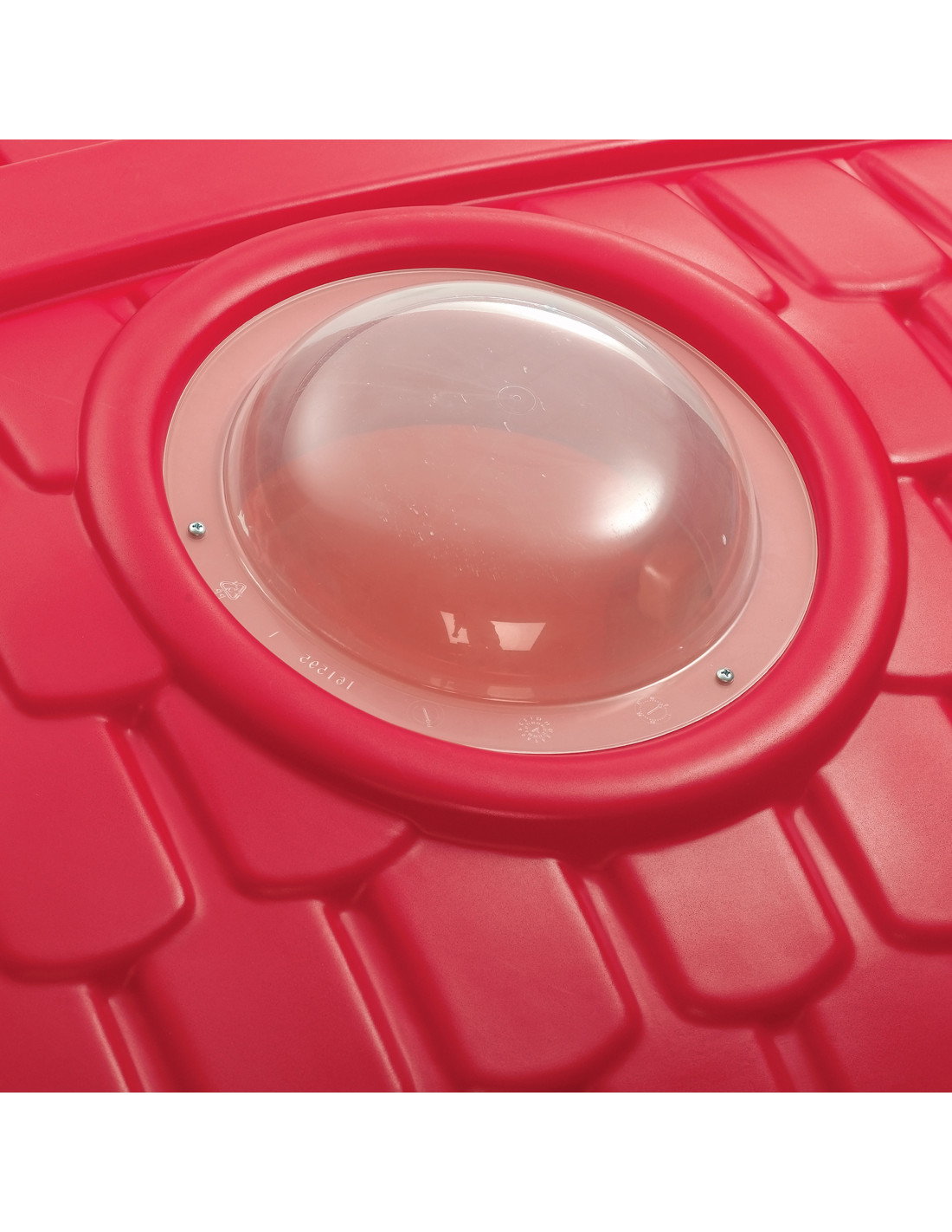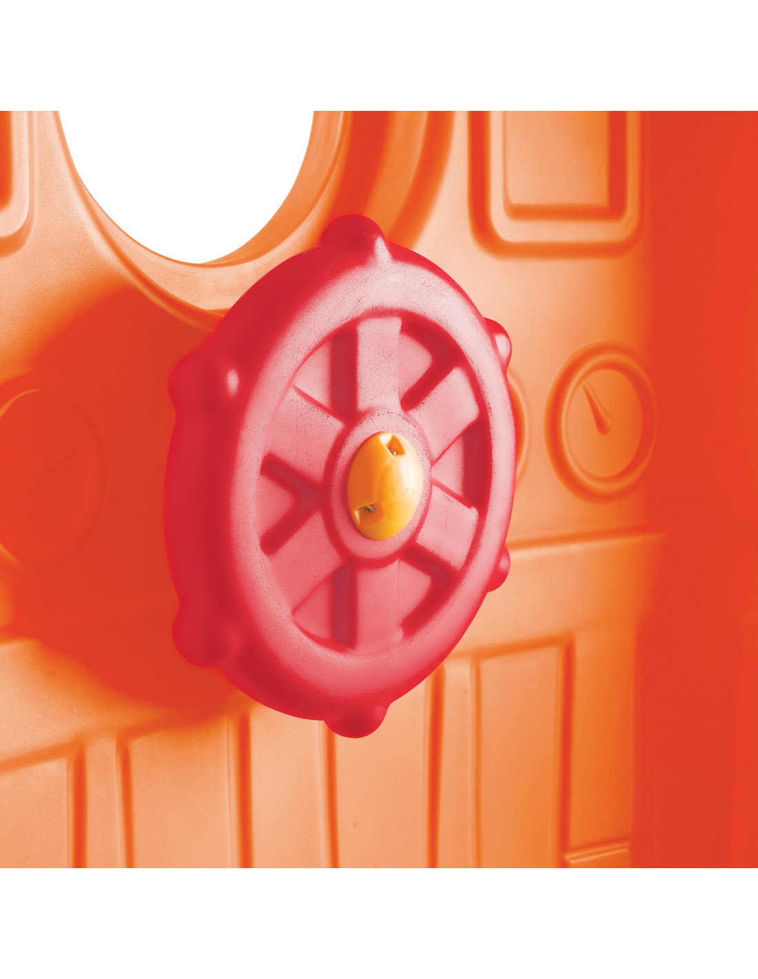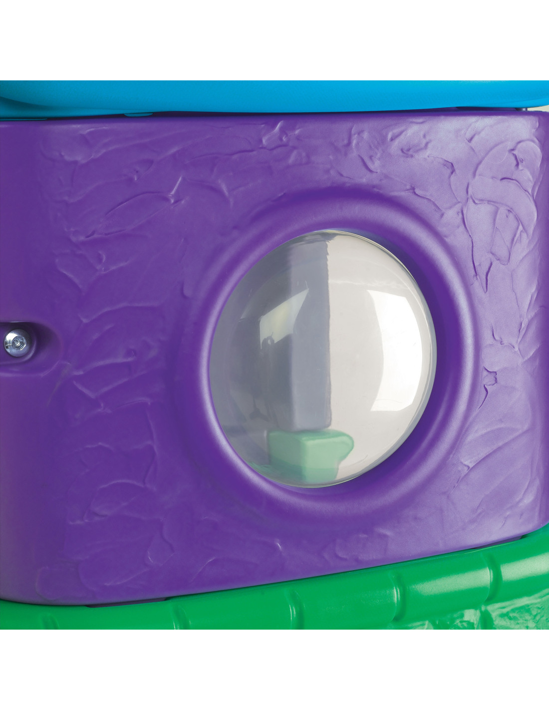 - - the house has a ladder with large steps , a handrail to help with climbing, a round window, a skylight, a steering wheel and a gentle slide with a slide length of 98 cm
