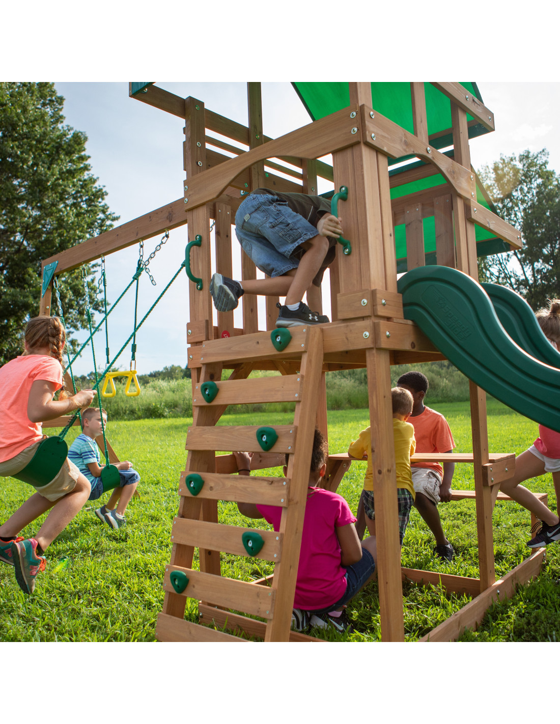 - Climbing Wall - More exciting than your average ladder, it stimulates coordination, muscle strength, and motor skills. Metal handles ensure safe and easy entry and exit from the connected upper fort.