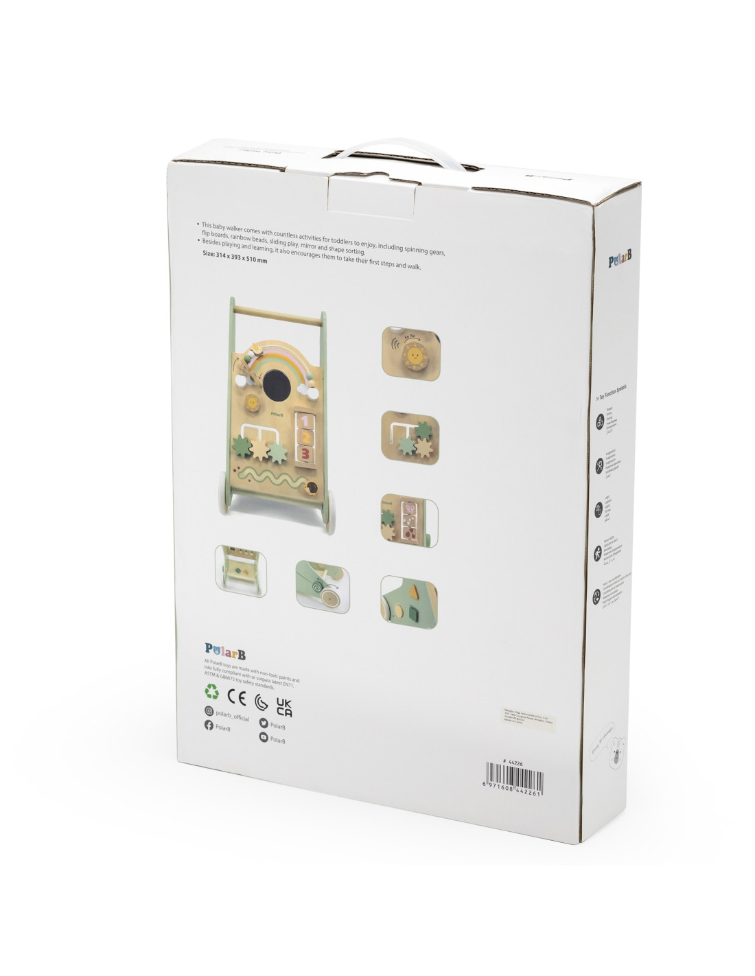 This PolarB educational walker for children, designed by the renowned toy manufacturer Viga, is equipped with many attractions that will keep little ones interested and occupied for hours. It includes spinning wheels, flipboards, rainbow beads, and a sliding board. This allows children to develop their senses and explore the world around them. The walker also includes a mirror and a shape sorting section, which positively impact cognitive development.