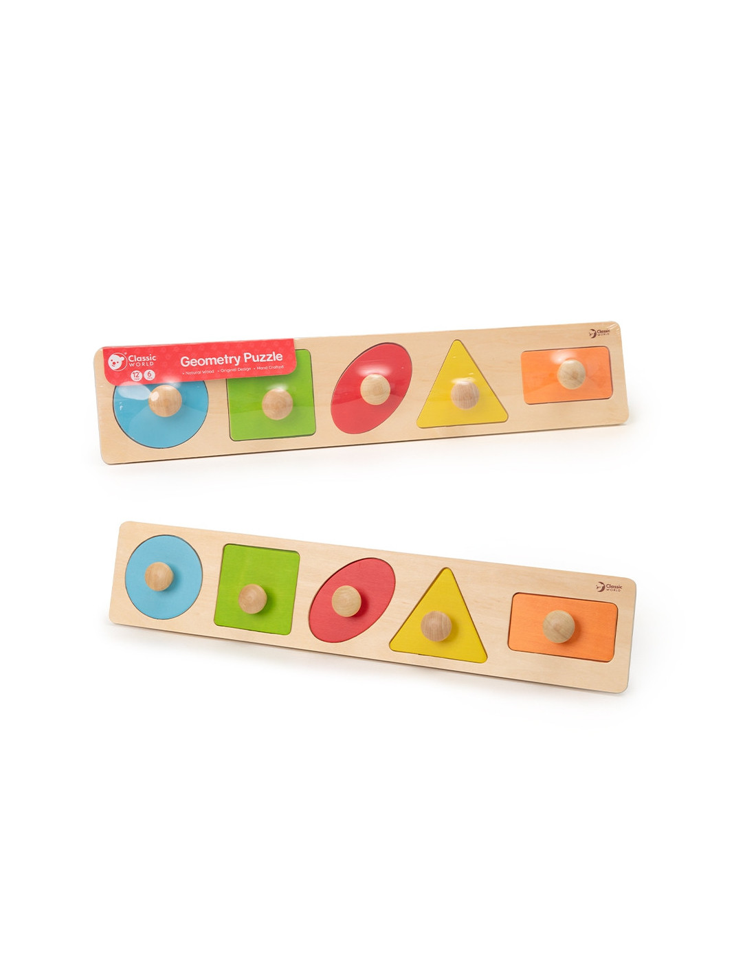 The Classic World Wooden Puzzle with Pins for children aged 12 months and up is an ideal solution for both home and preschool play. It consists of a board and six thematic pieces that need to be attached to it. The wooden base features recesses that correspond to the shapes of the colorful puzzle pieces. The entire puzzle is made of wood and painted with child-safe paints in vibrant colors that will delight every user and provide plenty of fun.
