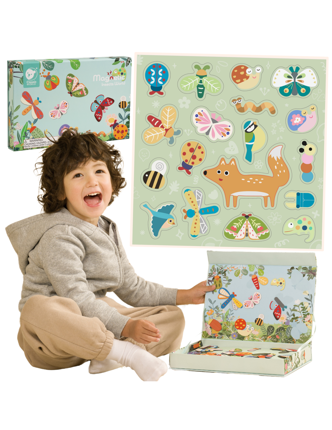 CLASSIC WORLD Puzzle – This magnetic puzzle set helps children learn and recognize the variety of animals they can find in the meadow! With each of the 18 animals featured , children can arrange the cards on the magnetic board and create their own stories . The game will develop their imagination , motor skills , and observation skills. A great way to spend time at home and learn new things.