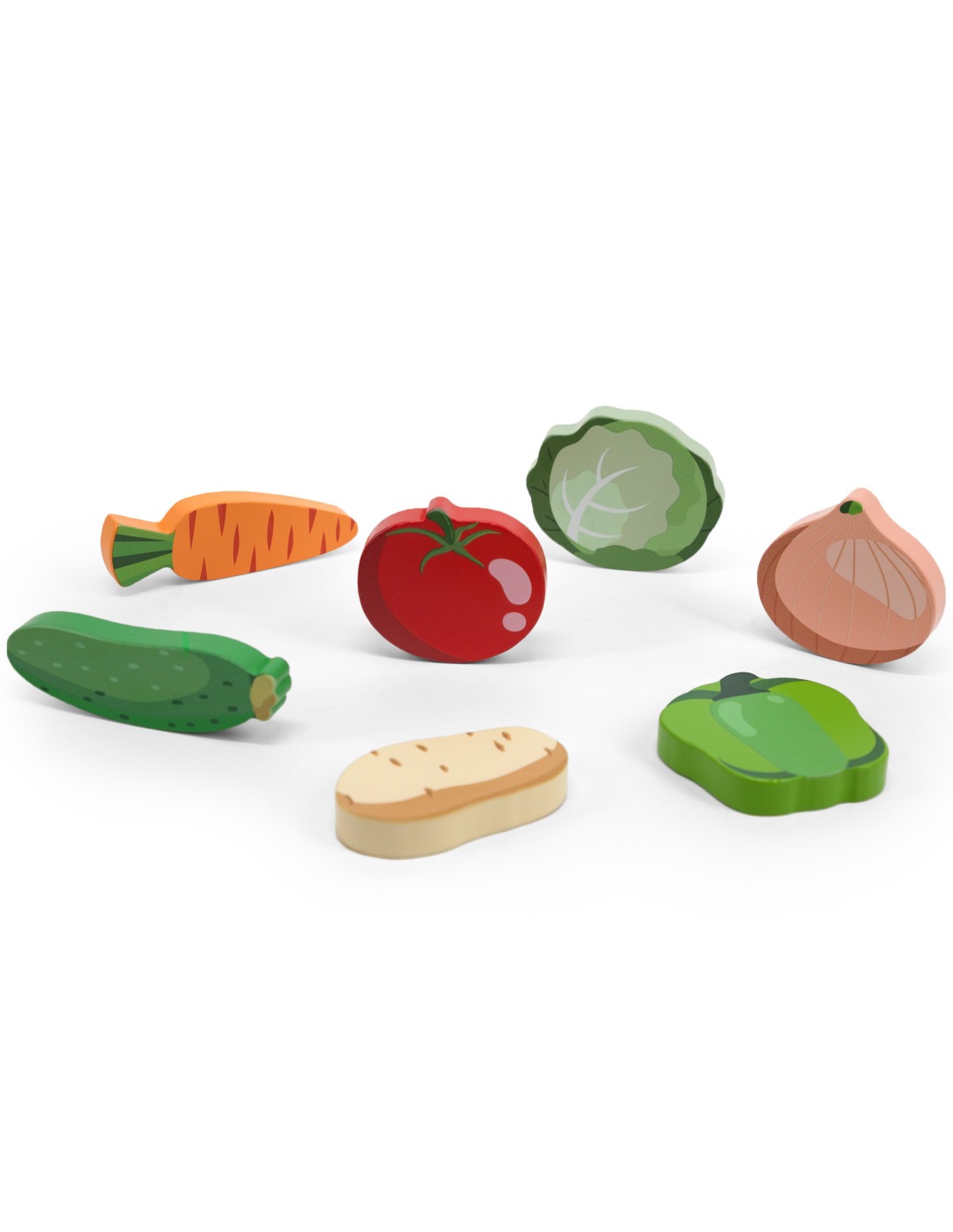 Wooden puzzle from VIGA featuring a vegetable motif. The set includes a colorful board and 7 pieces. The game involves matching the vegetable tiles to their corresponding spots on the colorful base, which features drawings of the missing pieces for easy reference. This type of activity will help develop precision hand movements , improve hand-eye coordination , and also train memory , logical thinking, and concentration . Thanks to the thickness of the pieces, the puzzle can be used as figurines for other games.