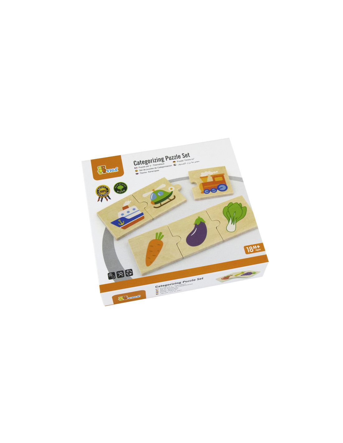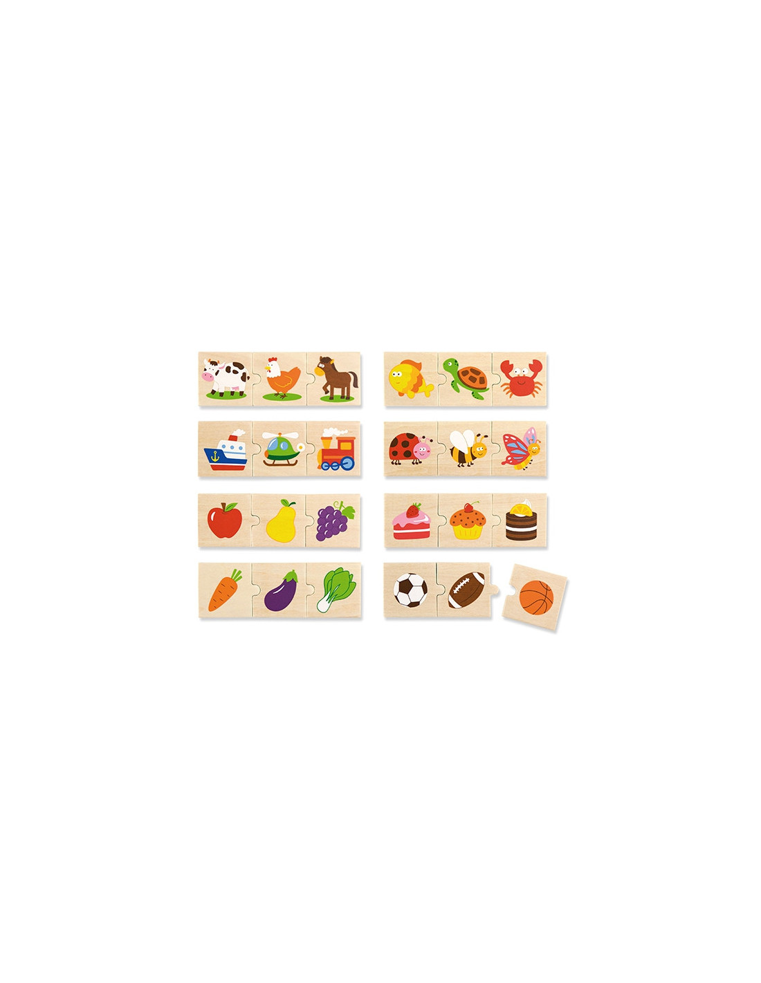 Zestaw 24 drewnianych puzzli, które łączą się w 8 trójek. Są to na przykład 3 zwierzątka, 3 pojazdy, albo 3 warzywa. Zadaniem dziecka jest oczywiście dopasowanie ich. Jest to zatem bardzo dobra zabawka edukacyjna, która w przystępny sposób jest w stanie wyjaśnić dziecku wiele rzeczy. Stymuluje logiczne myślenie i wyobraźnię. Obrazki są bardzo ładne i estetyczne, więc zabawka nie tylko wpływa świetnie na umysł, lecz cieszy też oczy.