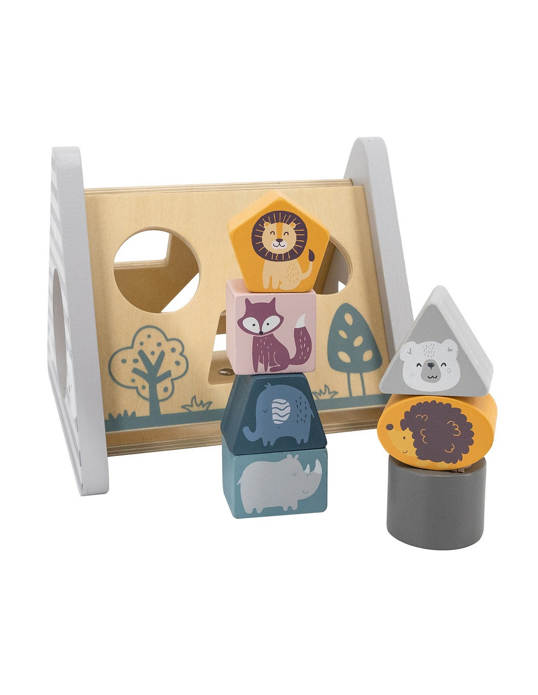 - - the child's task is to match the shapes of the blocks with colorful animal figures on them and press them into the appropriate hole so that they move to the other side of the five wooden sides of the pyramid-shaped puzzle covered with drawings,