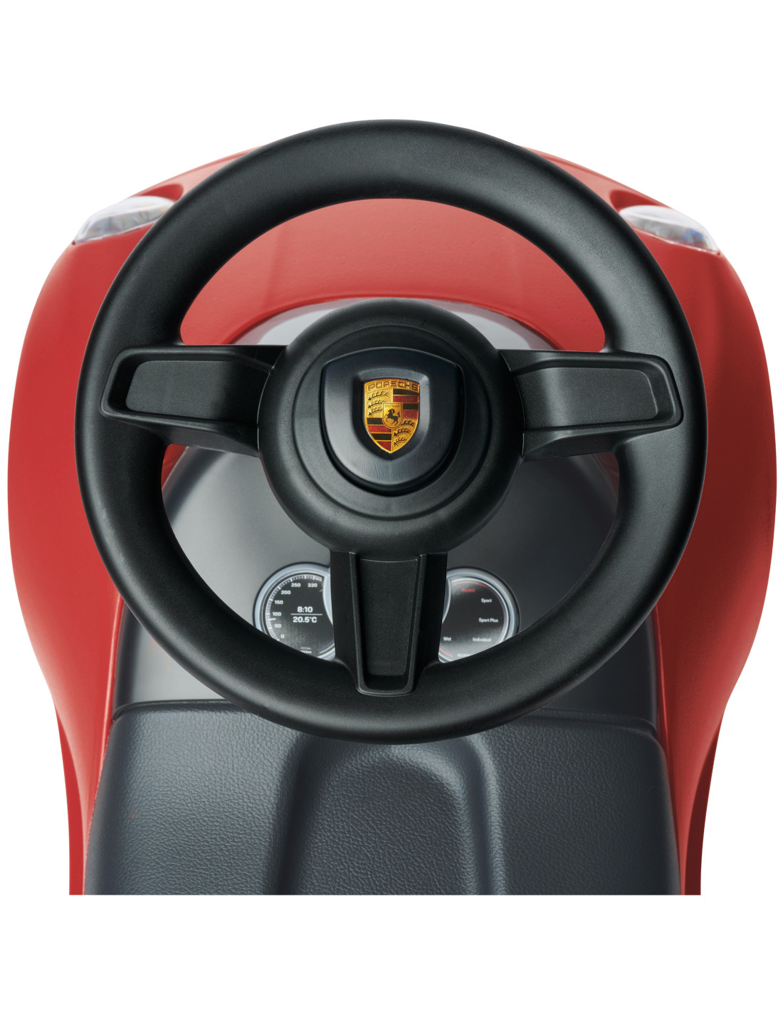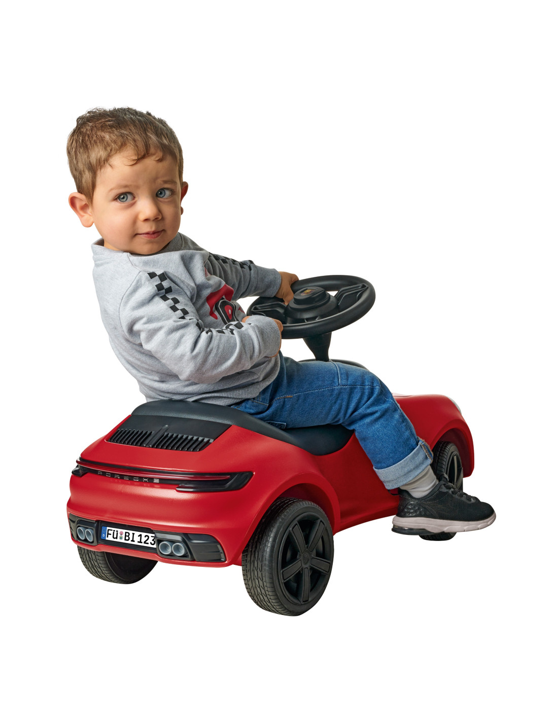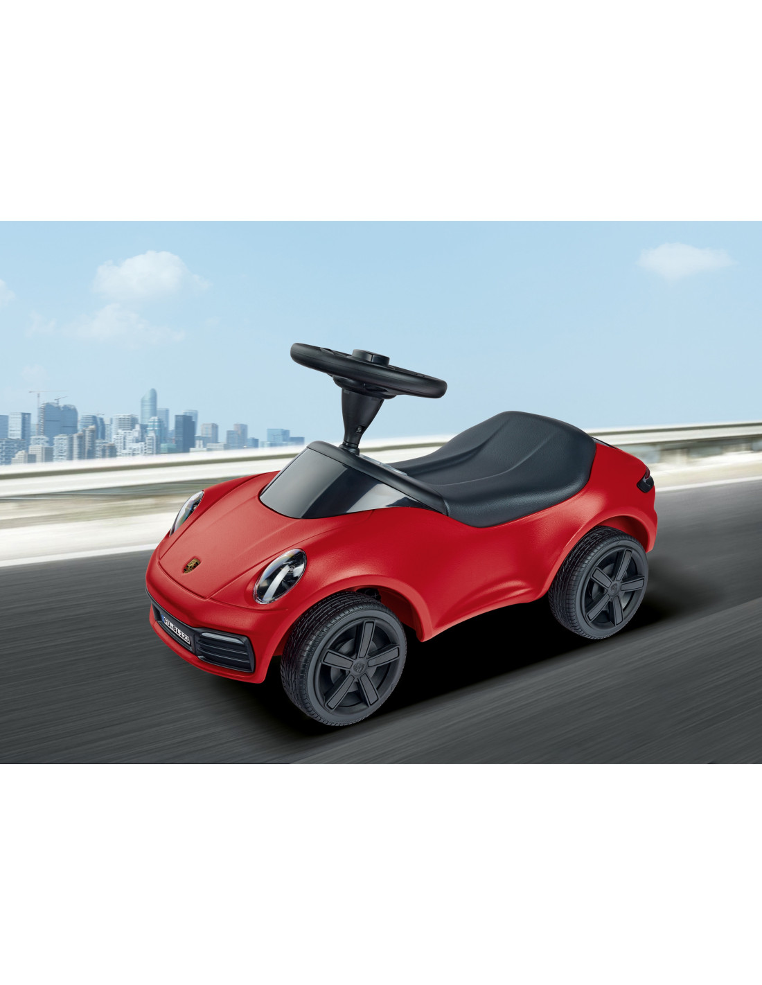 This beautiful Porsche 911 sports ride-on in classic red from the renowned BIG brand is the vehicle your child dreams of! Designed for toddlers who have already taken their first steps and are eager to embark on further journeys, it's built to help them develop their skills – mounting, dismounting, pushing, and steering. It features a steerable front axle for comfortable handling, quiet wheels , a low center of gravity, a steering wheel with a horn, and a removable, easy-to-clean foam seat .